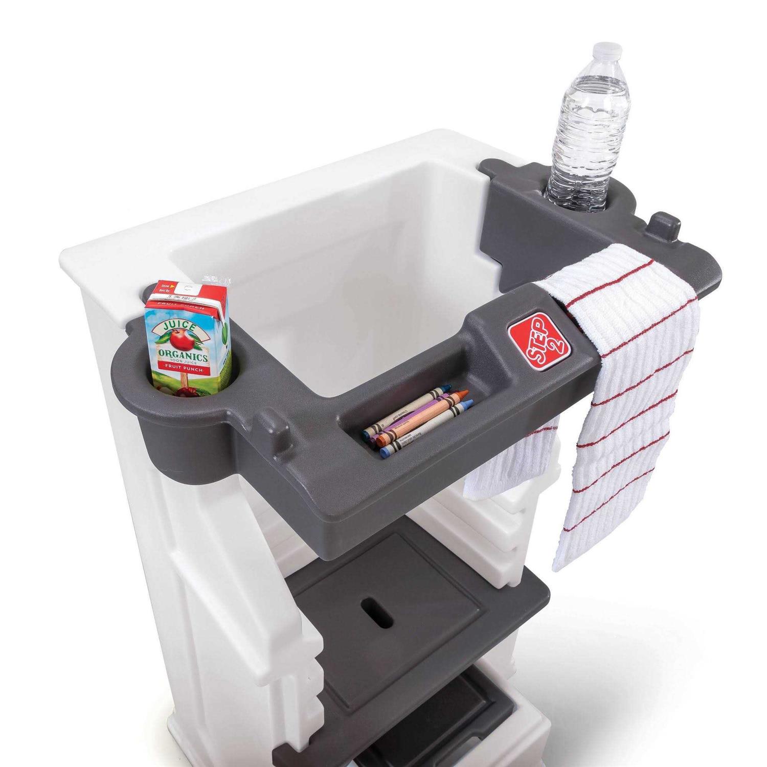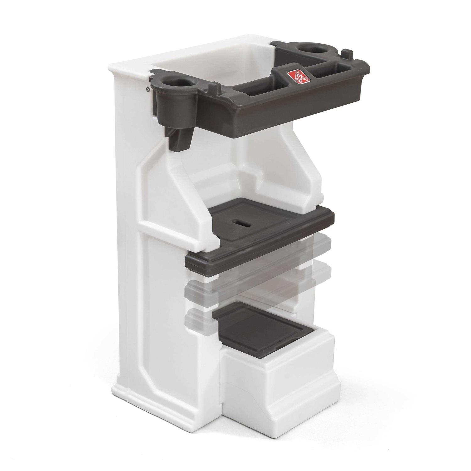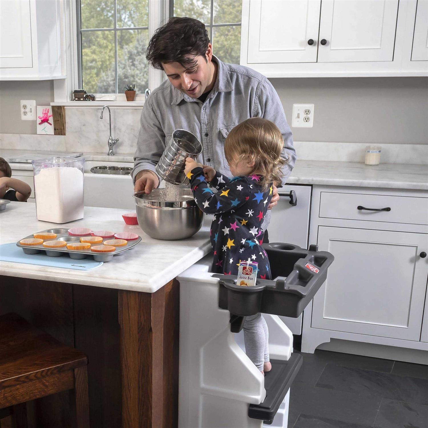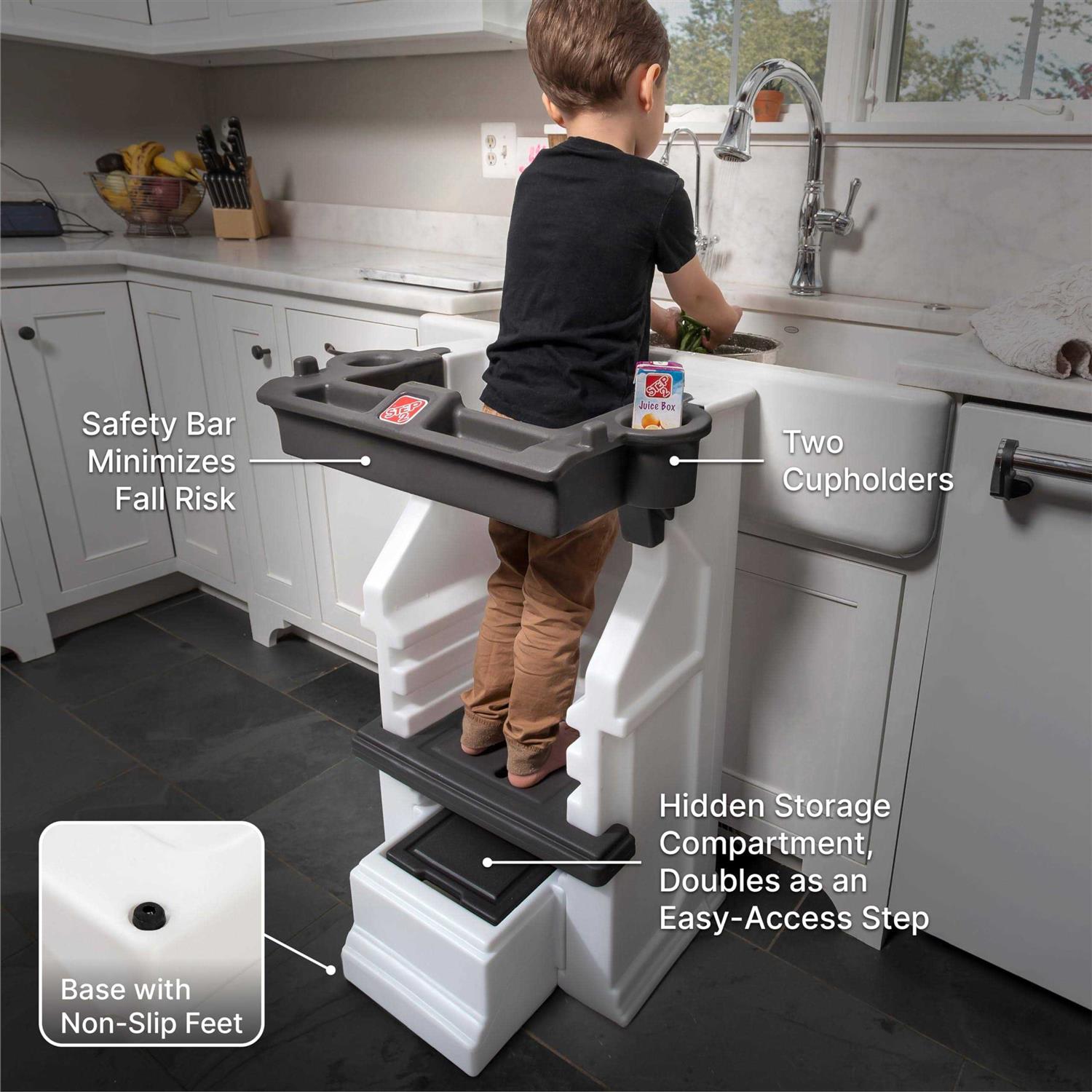 Step Stools by Step2. Details:Elevate your toddler to new heights with this safe, adjustable height step stool learning tower from Step2. This kids and toddler kitchen stand makes it easy to involve your toddler in a variety of countertop-height activities like meal prep, baking, crafting, and more. The stool step can also easily be moved to other areas of the home for hand washing, brushing teeth, and more. Highly durable and stable, this tower stand can last for multiple children. Three adjustable heights (step heights of 12.5”, 15.5”, and 18.5”) allow the kitchen helper to grow with your family. Child safety kitchen stool has walls on three sides, plus an enclosed safety bar to provide extra security. Safety bar includes two cup holders and two small storage nooks. Non-slip feet help keep the stool in place. Assembles in minutes. Made in the USA.