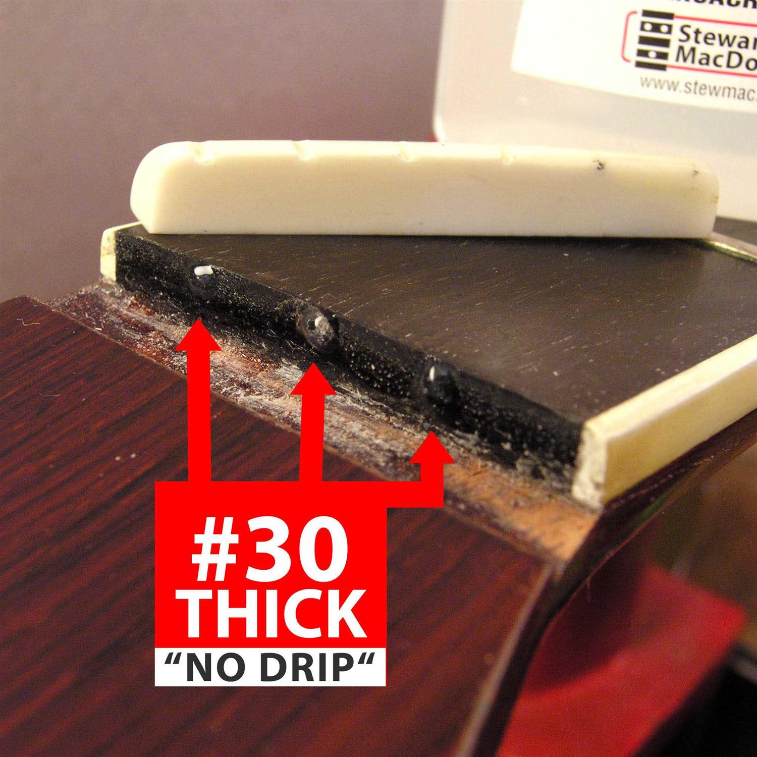 Speed your work by hours! Our super glues are first choice in guitar shops, thanks to fast, incredible bonding strength for repair work and instrument making. #10 Thin penetrates close-fitting wood joints and fingerboard cracks. Water-thin, it’s great for fast minor drop-fill repairs on guitar finishes, too. Cures in 3-5 seconds, for a strong moisture-resistant joint. – Spend less time setting up clamps and waiting for other glues to dry! Be ready for any repair situation that demands a fast permanent bond.JigsFrettingBindingInlaysFinish touch-ups – Nut slot repairs – The 1-ounce bottle is the practical size to minimize shelf life problems. To maximize shelf life, store super glues in a cool dry place. – Warning! Super glues bond skin and eyes instantly. Use in a well ventilated area. Keep out of the reach of children.