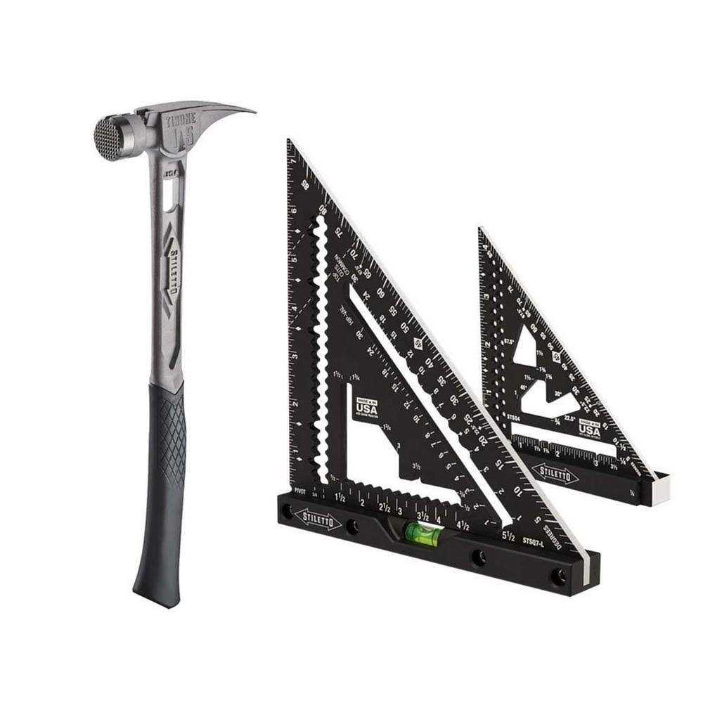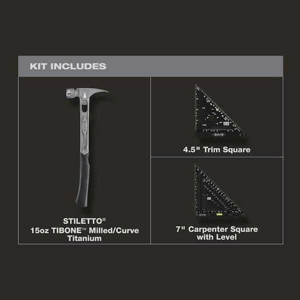 TI-BONE III Hammer with Steel Milled Face and 18 in. This 15 oz. full titanium hammer hits like a 28 oz. steel hammer, with 45% less weight and 10x less recoil shock. It is recommended for rough framing, remodeling, and pole barn construction. The TI-BONE III features a 180° side nail puller that allows you to pull 6D-16D nails with ease and includes a magnetic nail starter.The Stiletto Frame to Finish Square Kit includes the 7 in. Carpenter Square with Level and 4-1/2 in. Made for the carpenter, this kit is designed with more layout notches to help build and level faster. Additional notches aid in laying out material, common angles, and marking rafter pitches. Carpenter Square with Level features the BOMBER Cutout, which allows for repeatable stud measurements. The 4-1/2 in. Trim Square has ¼ in. and 3/16 in. reveal gauges to help quick set door casings. These squares are fully machined, with anti-glare finishes and the most durable coating.