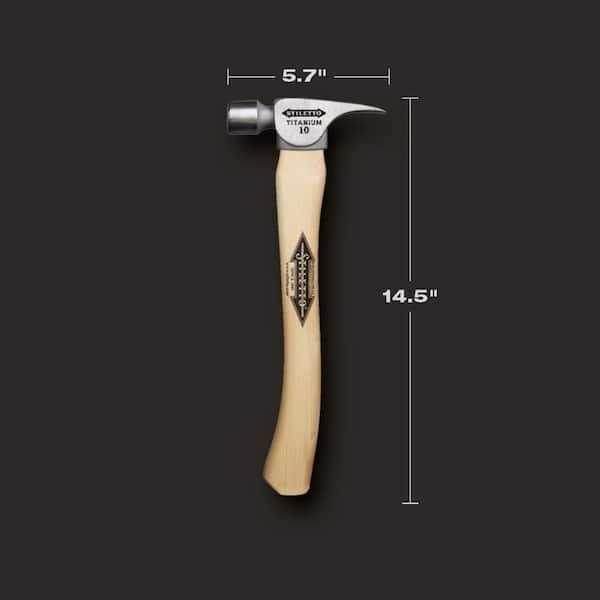 Smallest of our solid titanium hammers heads, the Stiletto FH10C is a 10 oz titanium smooth face finish hammer with a 14.5 -inch straight hickory handle. The hammer has a straight claw design and Stiletto’s signature magnetic nail starter. The FH10C has the comparable striking force of 16 oz steel hammer and is recommended for professional framing, remodeling or finish work. Stiletto Tool company has been synonymous with high quality hand tools dating back to 1849. With our long history and strong reputation, the brand has evolved into the modern day standard for innovative, lightweight, ergonomic, productive, and professional tools. Titanium is 45% lighter weight while providing the same striking force and strength as steel. Titanium tools also produce 10 times less recoil shock which helps reduce carpal tunnel syndrome. The combination of these features means less down time, more productivity, and most importantly less pain while working.