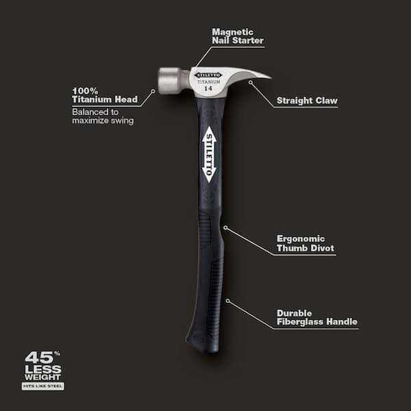 Lightweight 14 oz ounce titanium head with milled face hits like a 24 oz steel hammer, but with 45 less weight and 10 times less recoil shock. Less weight and less recoil helps to reduce carpal tunnel syndrome and tennis elbow which translates into less pain, less down time, and more productivity. The 16 curved axe-style poly/fiberglass handle with ergonomic nonslip black rubber grip and thumb divot offers greater comfort, increased grip, and more prying strength. Features magnetic nail starter on nose of hammer for easy 1-handed nail starts in overhead work. Dimensions 16 x 6.25 x 1.5. Weight 2.0 lb.