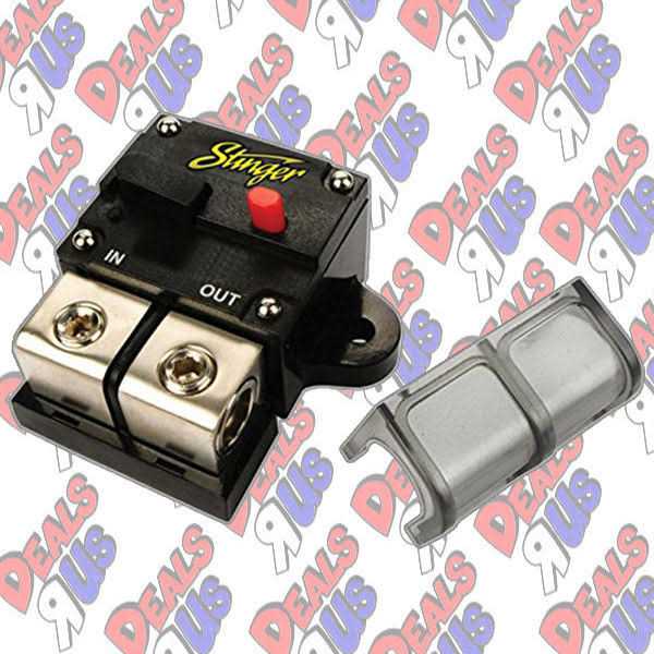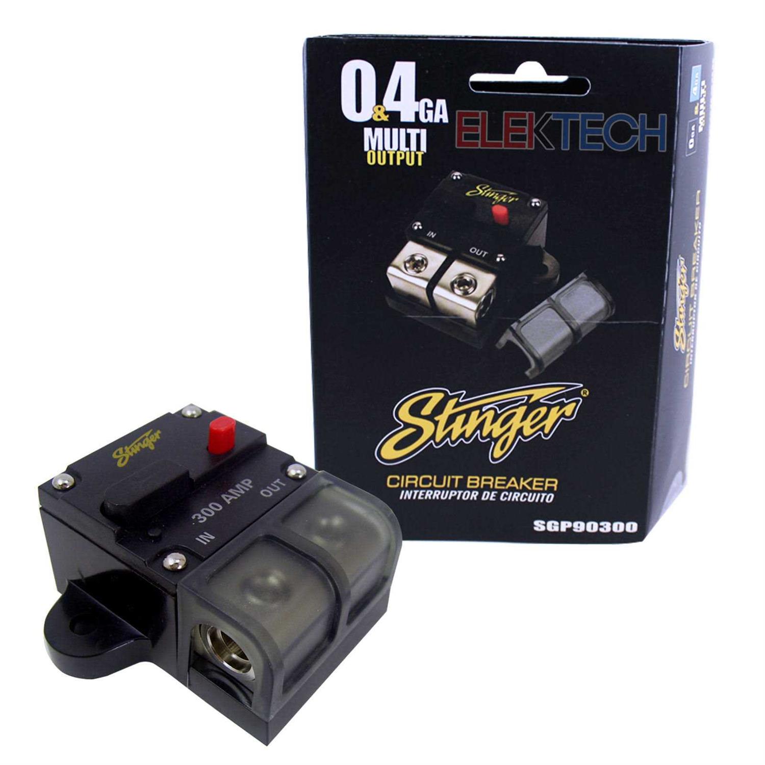 Stinger SGP90300 300 Amp Circuit Breaker Stinger SGP90xxx series circuit breakers are an excellent choice for circuit protection when the ability to easily set/reset/defeat the circuit is desired. The SGP90xxx series are perfect for applications were transient loads will meet or even slightly exceed the load rating (based on time duration, see chart #1). The load capability of the breaker is also temperature dependent and will affect the load break point and should be taken into consideration during system design. (see chart #2) SGP90xxx series breakers have very predictable characteristics that can be forecasted based on amperage load, duty cycle and ambient temperature.Features Audio System Example In a typical installation in an audio application where the breaker will be protecting an amplifier circuit. The transient characteristics of music will see an amplifier load swing drastically between min and max of the system when driven hard. An amplifier that has a full amperage of 150A may swing as high as 180A + and as low as 2A during use. This will work out to an average close to half the fuse rating of the amplifier (75A) and is well within the range of the circuit breaker (if 150A was selected) to allow for continuous playing of this system. If there is an issue with the system, a spike with a longer duration (fault) will trip the breaker and protect the system. Extreme Audio System/ Constant Load Example In an extreme audio installation or other constant load application the capacity of the circuit breaker will decline in direct relation to the time and size of the load, referencing chart #1. This would apply to other similar situation like use of inverters and other constant load devices.