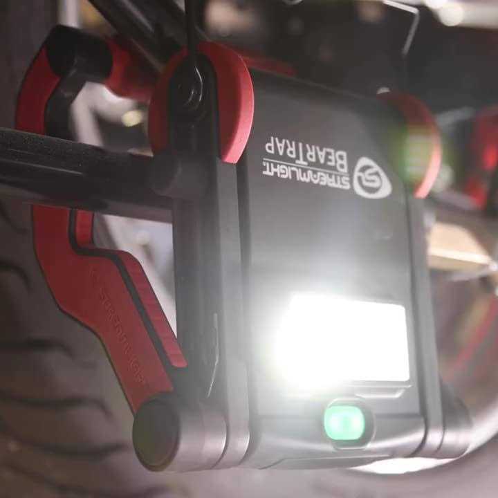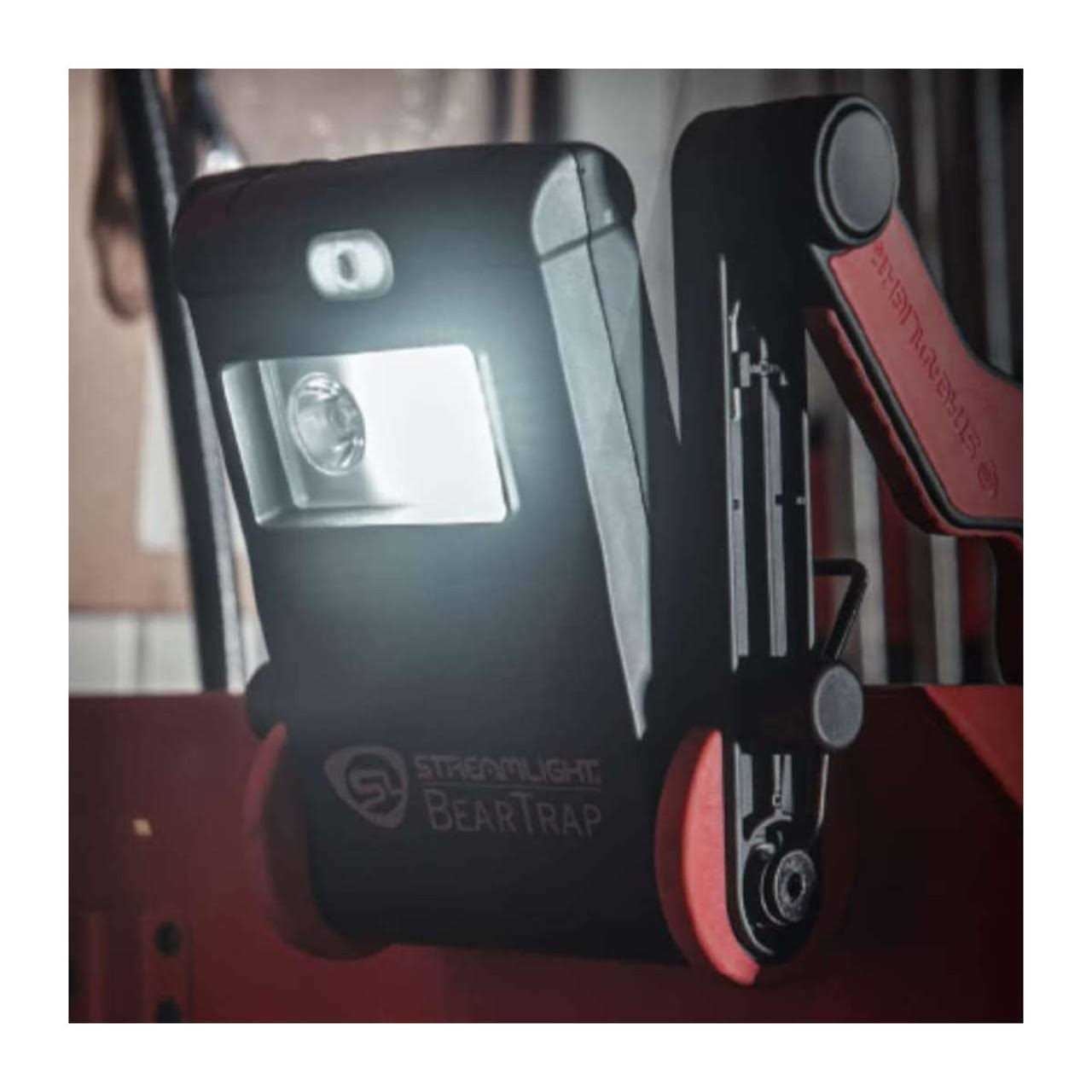 Job Site Lighting by Streamlight. Details:The BearTrap‘s unique design allows it to clamp to virtually any flat, round, or irregular surface. There’s a handy folding wire handle to help open the spring-loaded clamp and it doubles as a hook for added versatility. It features spot and flood LEDs, a total of six output modes, and 2000 lumens. The body can rotate 270 degrees in the light frame and will also stand on its base or attach using the magnets in the crossbar.