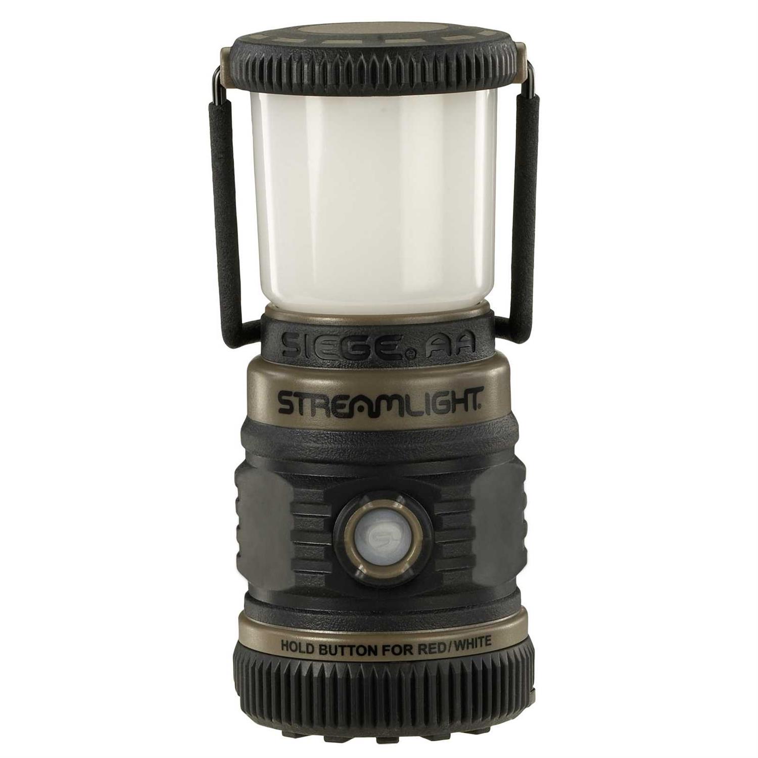 The siege lantern is more versatile than other emergency or camping lanterns.Tough polycarbonate thermoplastic construction with elastomer over mold and rubber molded base provides stability on slippery or uneven surfaces.It has one white light settings two red light for softer less intense light and an sos mode.Its d-ring allow you to hang it and is spring-loaded.The ergonomic handle is designed to lock in an upright or stowed position while the incorporated hook allows for hanging on an edge branch rope cables pipes. Material: Thermoplastic Type: Lantern Output: 50/100/200 Lumens Bulb Type: LED Body Diameter: 2.37 Oal: 5.40 Weight: 9.10 oz Battery Size: AA Proofs: Impact/Water Resistant Color: Coyote Rechargeable: No Filter Color: Red/White Switch Type: Pressure Pad.
