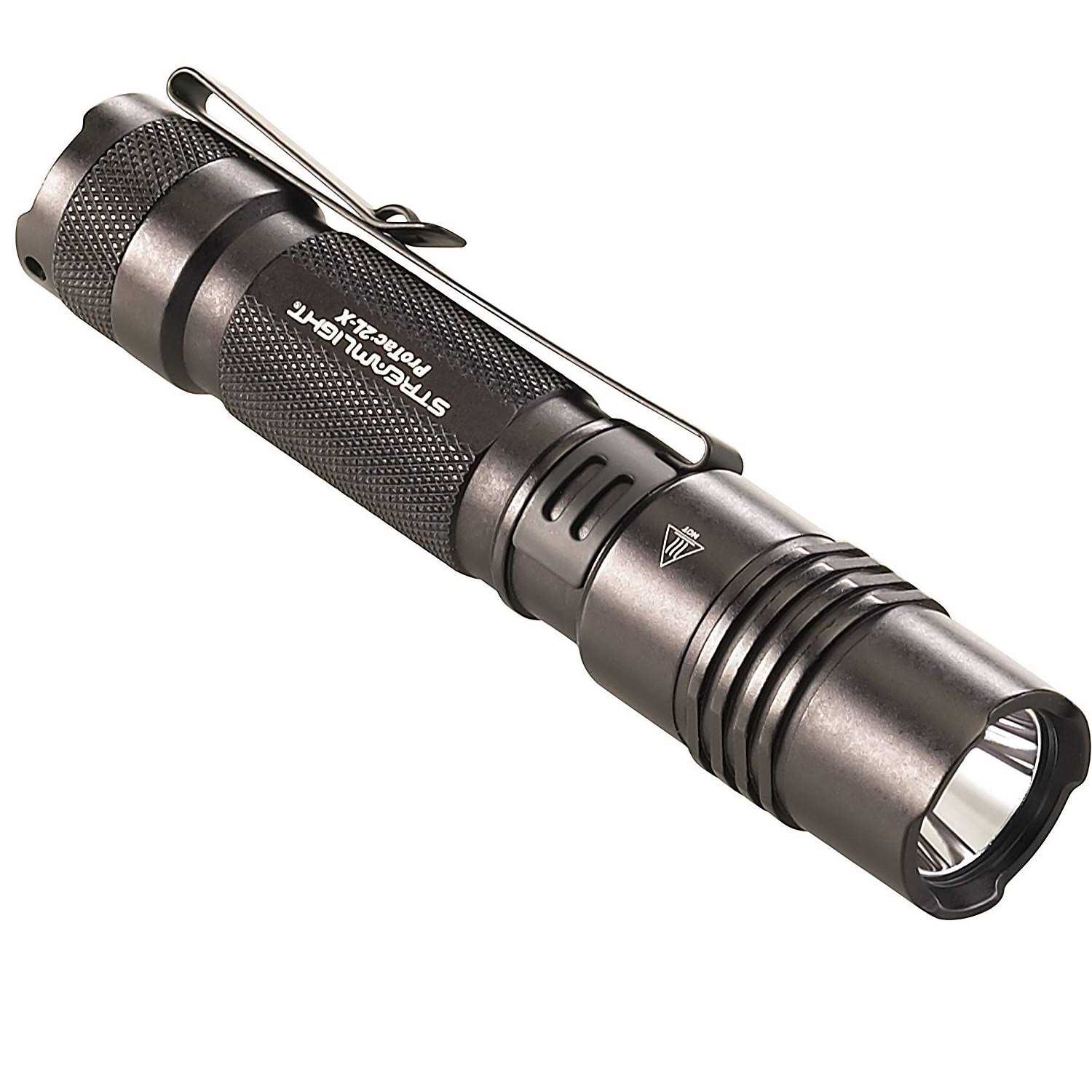 The Streamlight ProTac 2L-X is a compact, portable flashlight that still provides a lot of output. Its powerful C4 LED has a maximum brightness of 500 lumens, and also features a low-power mode for longer-lasting illumination. Its strobe function allows you to signal to friends or disorient foes, and its TEN-TAP program switch selects between three programs to give you quicker access to the modes you need: high/strobe/low, low/high, and high only. Its dual fuel system allows it to run off the two included CR123A batteries or a Streamlight rechargeable 18650 lithium battery, and its Solid State power regulation ensures constant output as the batteries drain. The flashlight is made from rugged anodized aluminum for maximum impact resistance, and also boasts an IPX7 water resistance rating. It comes with a tough nylon holster for portability, and can also be carried on its removable pocket clip.