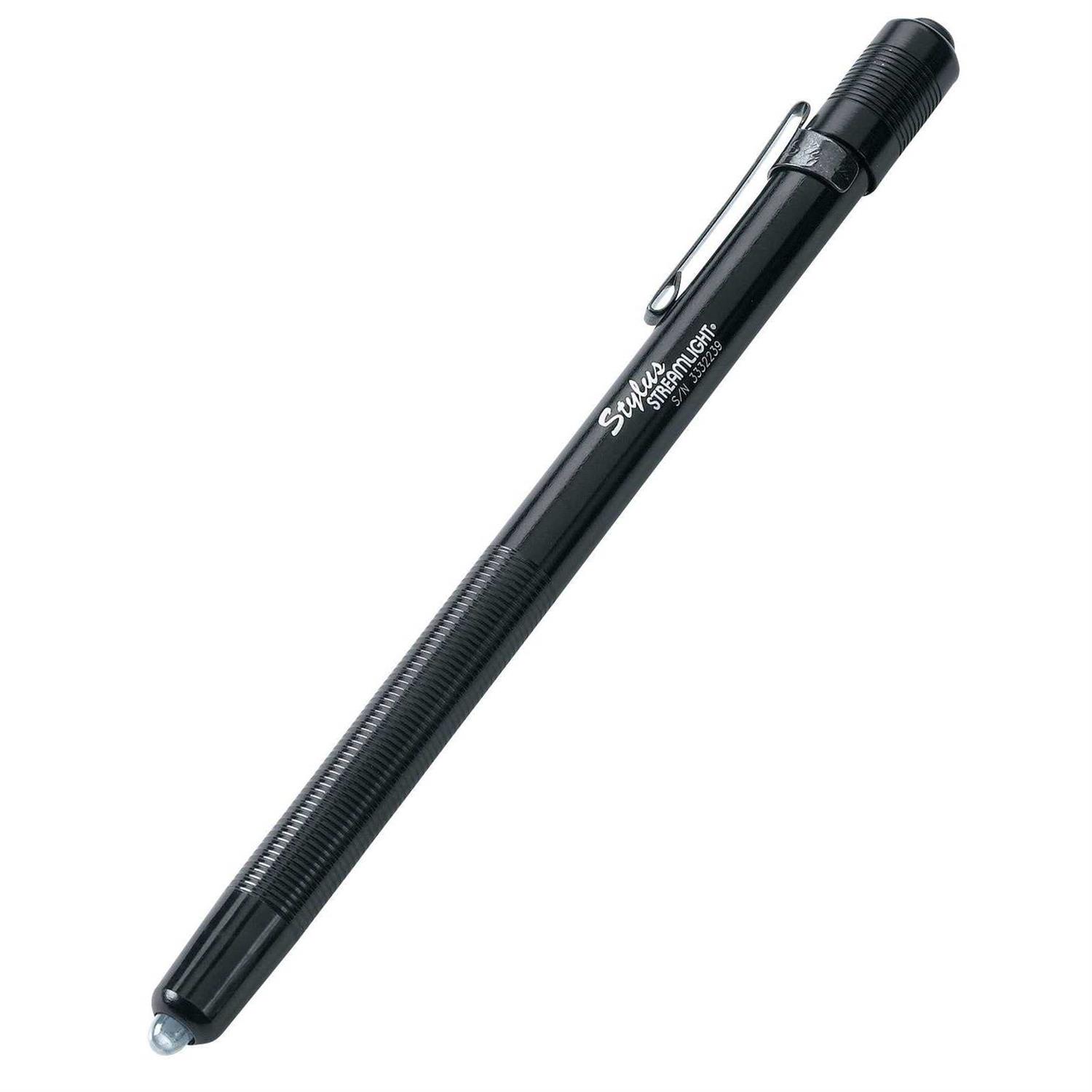 Size: 6.21 in length x 3/8 in diameter. Bulb type: White LED.Color: Black. Bulb life: 100000 hrs. Number of batteries: 3. Pocket clip and glare guard protector (included). Nonslip, knurled grip comes in black, gold or silver, red, blue and camouflage. High-intensity “solid-state” light emitting diode (led) available in arctic white, flame red, ice blue, navigation green or 390 nm ultra-violet. UL and CUL Listed for Class I, Division 1. Stylus 3 AAAA Alkaline Black Anodized Aluminum Pen Light is waterproof. Stylus Pen light in black color includes white LED bulb of 100000 hrs operating life and has waterproof aluminum construction. Flashlight requires 3 AAAA alkaline batteries to operate and comes with pocket clip/glare guard protector.