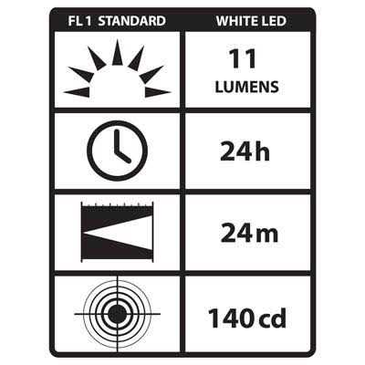 - 24m beam distance 11 lumens runs 24 hours Blue