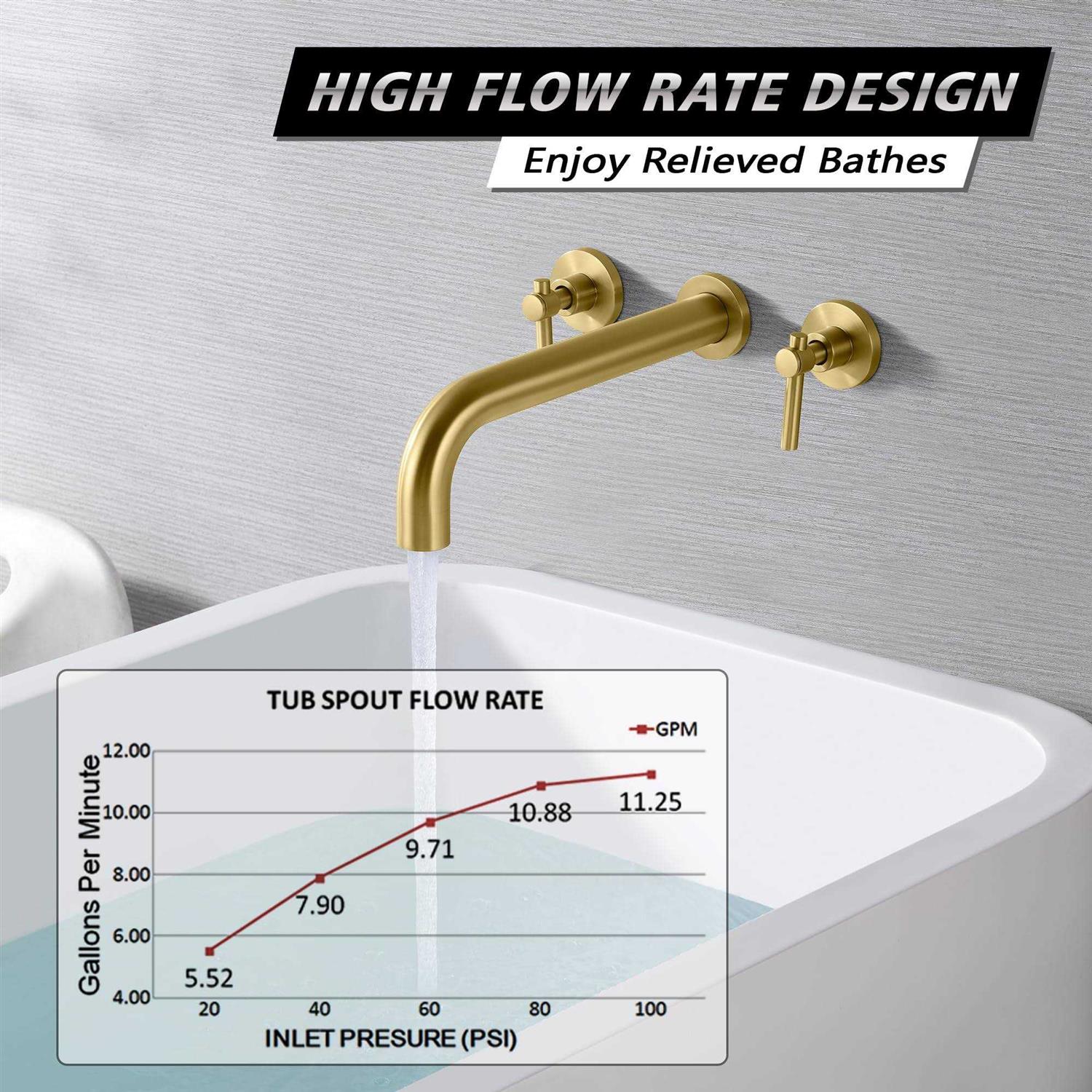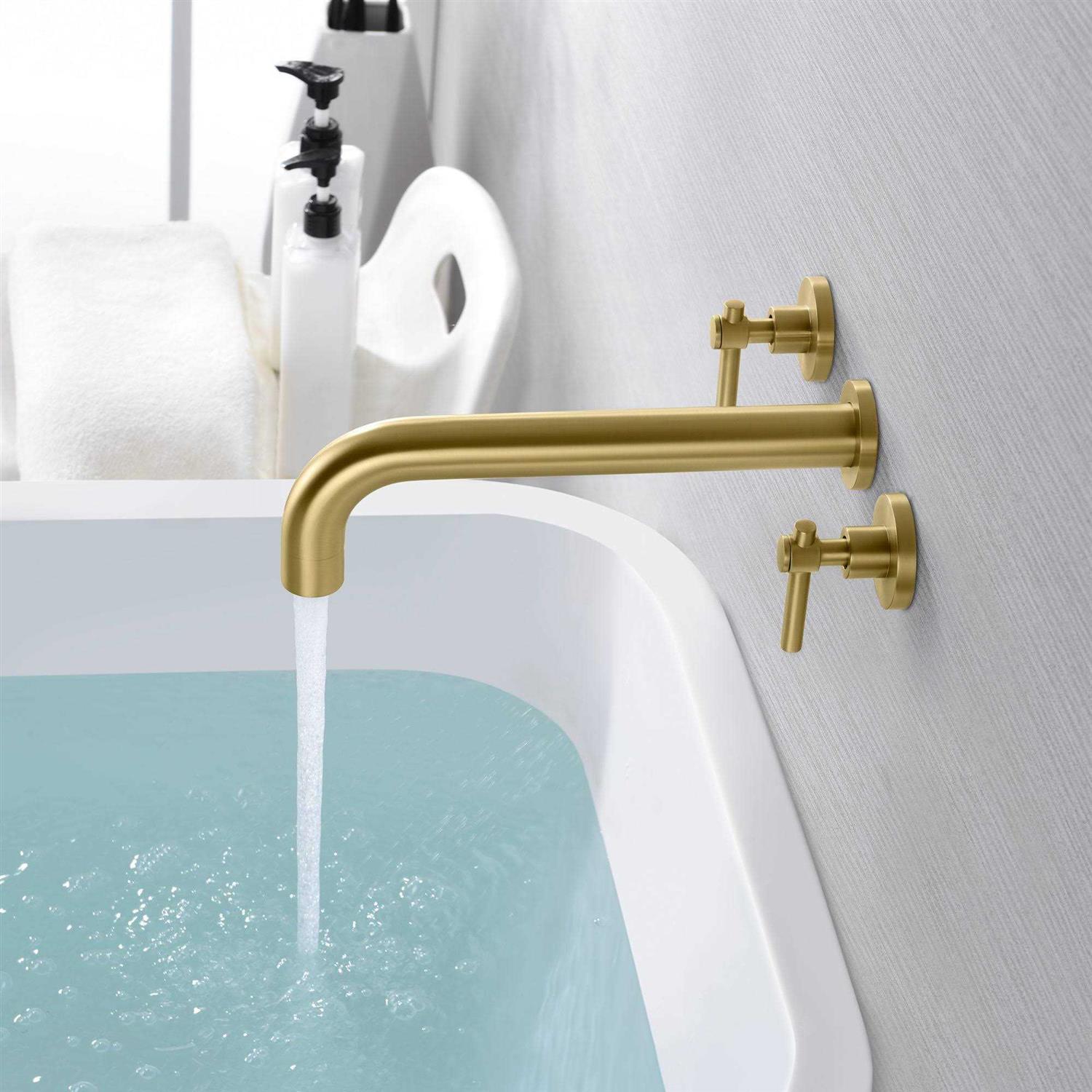 Complete the look of your bath with this sumerain double handles wall mount tub filler! Paired with crisp lines and brushed gold, it wins praise not only for its presentable looks but also for its lasting durability. Solid brass construction and ceramic disc cartridge provides many years of supreme performance and resists to corrode and leak. 9.71GPM spout flow rate at 60PSI, this wall mount bathtub faucet can fills up your tub in minutes. 11-11/32 Inches extra long spout reach. Two easy turn lever handles controls water and temperature, smoothly and effortlessly. To save time and extra expense, please show your plumber the installation video under the main image on product page before installation and please keep the user manual properly for the future need. Model: S2134BGI Product Name: Wall Mount Tub Faucet Material: Brass Finish: Brushed Gold Flow Rate: 9.71GPM@60PSI