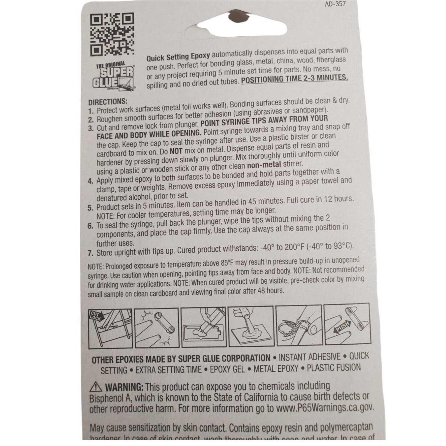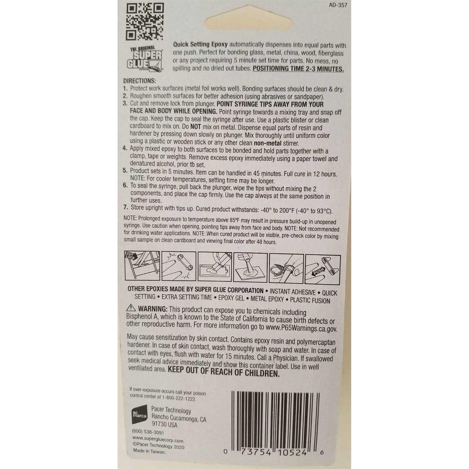 Use these Super Glue Brand clear quick-setting epoxy syringes for an extra durable hold with a short 5-minute curing time and an east to use applicator. It only takes 5 minutes for this quick setting epoxy to set. It is clear and works great for routine use in homes, office buildings, art studios, workshops, and more. Works well on glass, metal, and many more materials. Caution: irritating to eyes and skin.