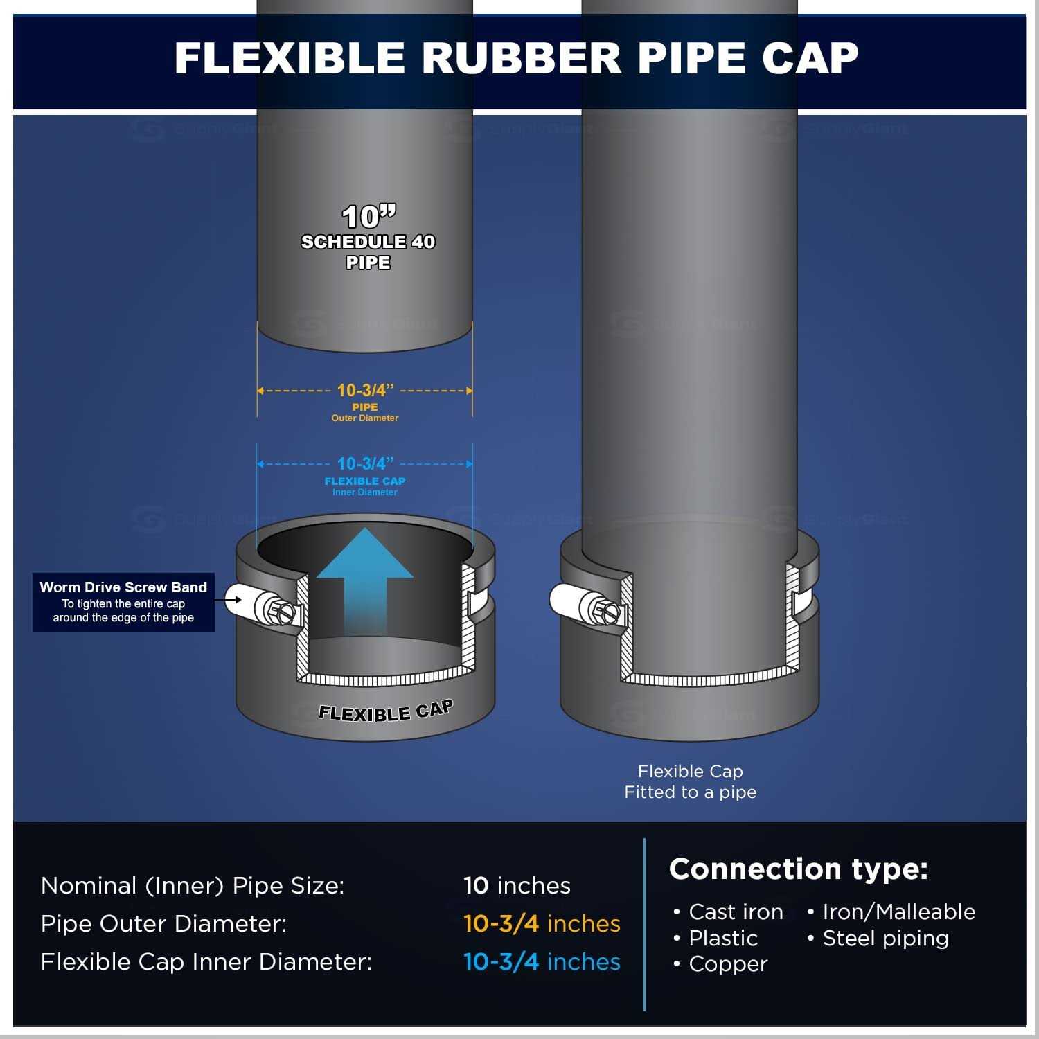 Supply Giant 10IFC Flexible PVC Pipe Cap with Stainless Steel Clamps, 10-3/4″ Inner Diameter for 10″ Nominal Pipe, Black