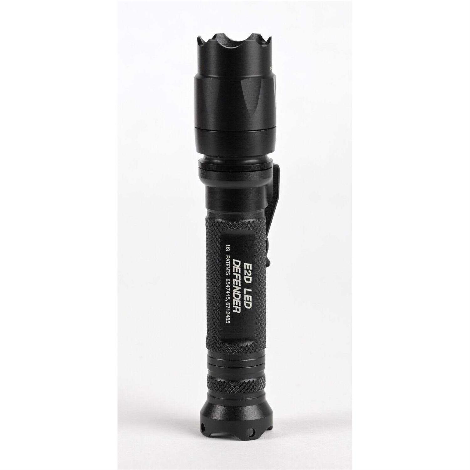 The E2D LED is a compact, dual-output flashlight with self-defense enhancements. It features a virtually indestructible power-regulated LED emitter and a Total Internal Reflection (TIR) lens. The E2D LED’s pushbutton tail cap click switch lets you activate the flashlight and select output level: press or click for a 200-lumen high beam ten times the light of a big two-D-cell flashlight, more than enough to overwhelm an aggressor’s night-adapted vision; release or click off and press or click again for a 5-lumen ultra long-runtime low beam that’s suitable for navigating around a dark room or parking lot. The Defender’s crenellated Strike Bezel(R) and scalloped tail cap provide further defensive options should the need arise.