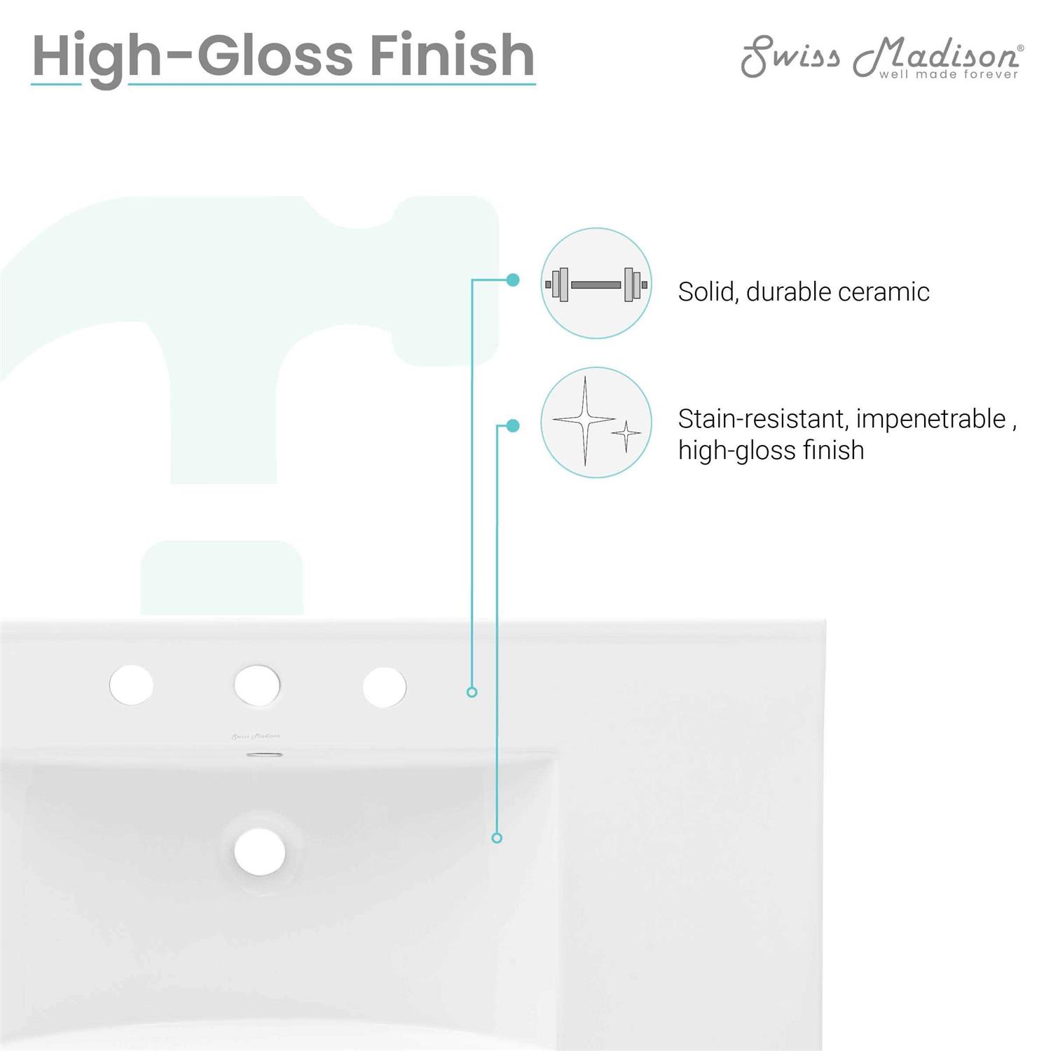 Swiss Madison Vanity Top Sinks combine ease of installation with a modern design into one single attractive package. The vanity top provides a smooth surface for everyday items before sloping gently into its spacious basin. A luxurious high-gloss finish protects the sink from scratches and stains.