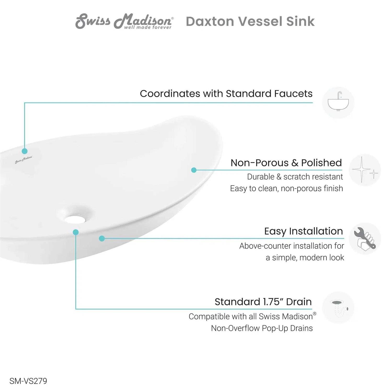 The Daxton Vessel sink is a sleek and modern addition to any bathroom setting. This extremely durable, polished, and non-porous finish makes it not only aesthetically pleasing but also very practical for long term use. Its scratch-resistant and solid, durable ceramic make this sink stain-resistant and easy to clean. Additionally, this sink coordinates perfectly with standard faucets, making it a hassle-free and easy above-counter installation. This vessel sink is compatible with all Swiss Madison non-overflow pop-up drains and is easy to maintain and clean.