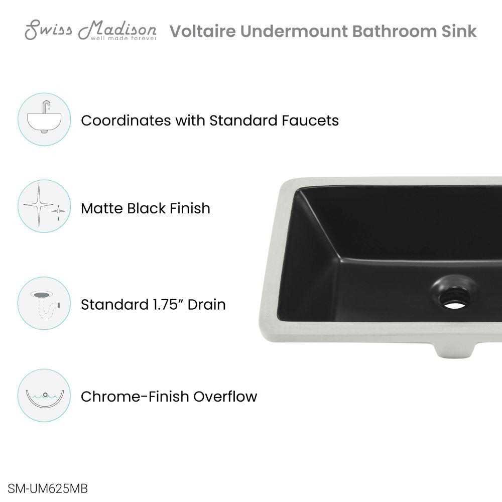 Sleek and contemporary, part of the Voltaire collection, 21 in. Rectangular undermount bathroom sink features a timeless design that suits both traditional and modern bathroom decors. Blend it with your choice of countertops for a clean look. Pairs Seamlessly with your choice of Swiss Madison faucet. Color: Matte Black.