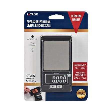 Although small in size, the Taylor High Precision Portioning Scale packs in a lot of BIG features!! The digital scale has a total capacity of 16oz/500g. Typically, these small scales weigh in grams only and rarely up to a full pound, making this one great for portion control, tracking metrics for a healthier lifestyle and many other household functions. This self-storing scale comes with a snap on lid that doubles as an extended weighing tray with side walls to hold in ingredients. The stainless steel measurement platform (2.3 inch x 2 inch) is easy to clean when not using the tray. Two-button control keeps the functions simple. Whether measuring fresh or dried herbs, food for dietary portions, loose teas, or small amounts of baking ingredients this scale is sure to be a household staple. Youll get addicted to the portability and accuracy! 2AAA batteries included.