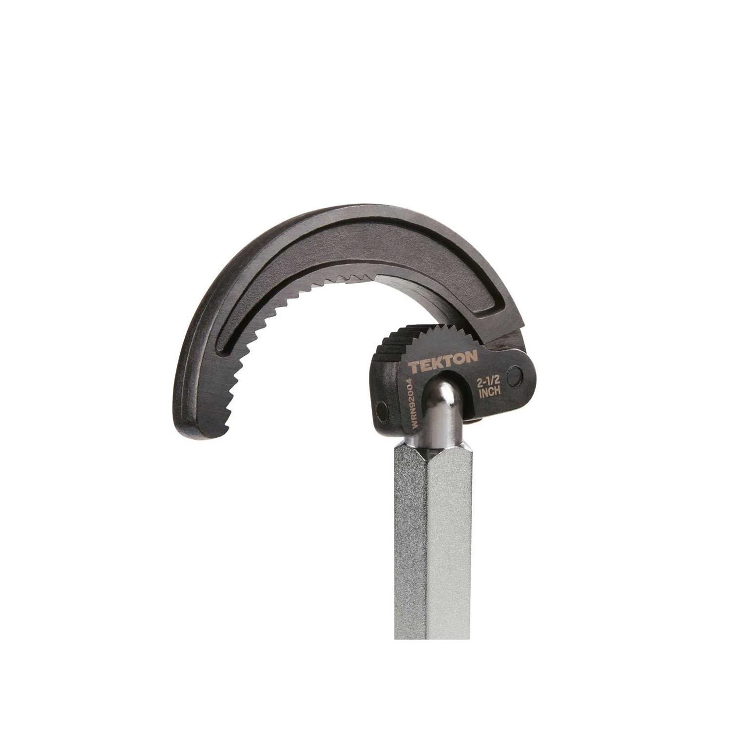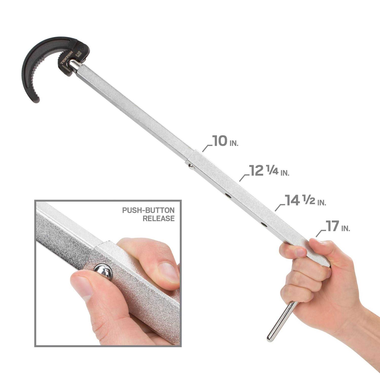 Uniquely designed for easy, one-handed operation in confined areas, the TEKTON Telescoping Basin Wrench takes the frustration out of under-sink work. Ideal for larger nuts and retaining collars on faucets, supply lines, valves, pipes and drain cups, this wrench is specially designed with an extra-long upper jaw that accommodates sizes from 7/8 in. to 2-1/2 in. outer diameter. As it slides onto the nut, the spring-loaded jaw automatically adjusts to the right size, so there is no trial-and-error hassle. Once in place, it creates a continuous ratcheting action that stays engaged with the nut, eliminating the need to refit after each turn. Pivoting smoothly through 180°, the wrench head has a friction stop that holds it at any angle, allowing you to navigate around obstructions and access hard-to-reach nuts. The four-position telescoping shaft adapts to any situation with the push of a button, locking in place at 10 in. 12-1/4 in. 14-1/2 in. and 17 in. lengths. This extra reach is especially helpful under deep bowl sinks. With a removable 6 in. high-leverage handle, the wrench easily stores in a toolbox or drawer.