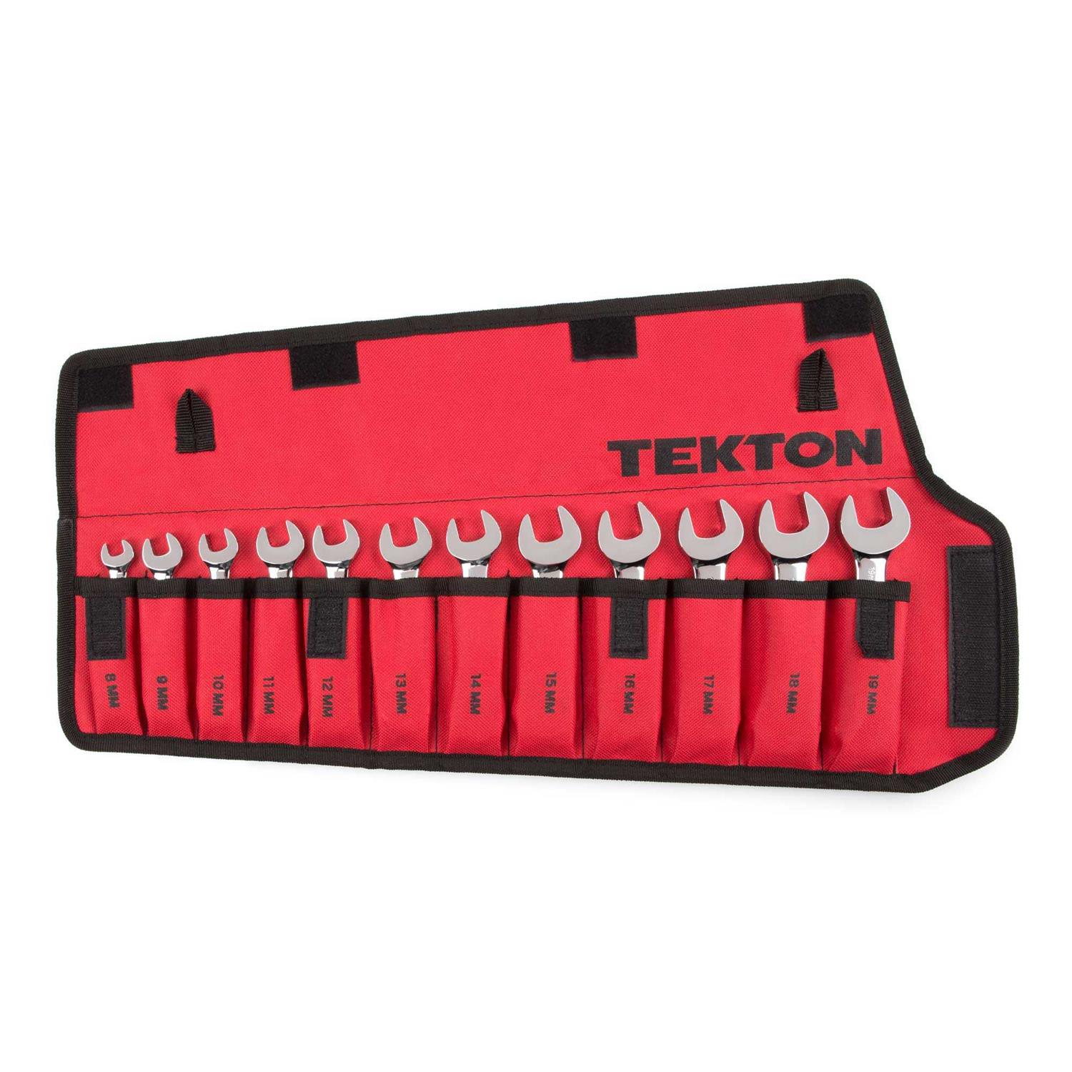 A complete series of every size from 6 – 24 mm, the TEKTON 19-pc. Combination Wrench Set is compactly organized in a wrench organizer rack. Open ends are angled 15° and box ends are designed to grip flat sides of fastener heads, not corners, to prevent round-off.