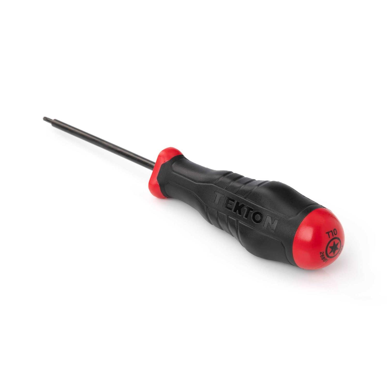 Combine power and speed with the unique handle of the TEKTON T10 x 4 in. The handle relies on three-sided geometry, not just friction against your skin, giving you the comfortable leverage to break stubborn fasteners loose. For easy installation and assembly work, rounded top and bottom sections let your fingertips spin long fasteners quickly. The blade is made of premium chrome molybdenum steel and is strengthened through an exacting heat treating process. Rather than a layer of plating, the steel surface of the blade is directly treated with a hot black oxide finish-the same process used to protect firearms. This finish can’t flake off, and it preserves the precisely sized tip for an exact fit in fasteners over time. The butt end has a clear size marking that is easy to identify in your tool belt or chest drawer. TORX is a registered trademark of Acument Intellectual Properties, LLC.