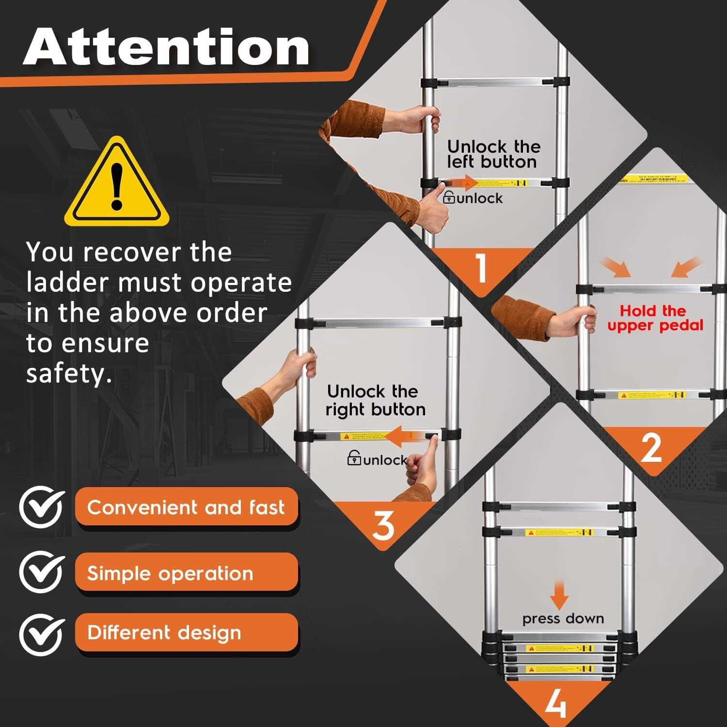Safety of Use: The high quality construction of the telescoping ladder ensures that each part retracts safely. Smart locking pins hold the parts in place and prevent sliding, and the ladder will retract smoothly and slowly.