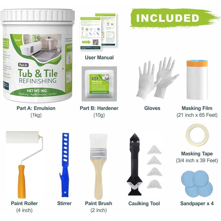 Tenee Tub and Tile Refinishing Kit 35oz, Tile Bathtub Refinishing Kit White with Tools, Tub and Tile Reglazing
