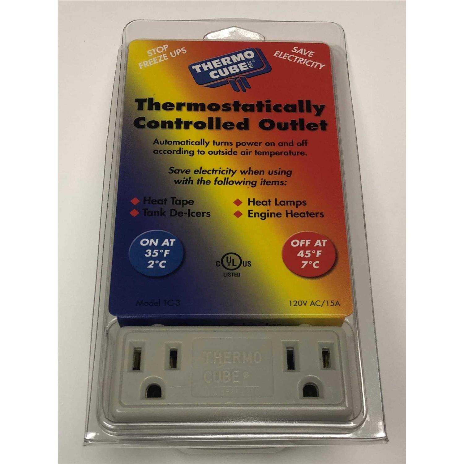This temperature controlled thermo cube plugs into any standard 15 ampere outlet to provide electrical devices with temperature regulated operation. The dual receptacle device activates when temperatures lower to 35 degrees Fahrenheit and off when it hits 45 degrees Fahrenheit. Ideal for home and farm applications such as pond de-icers, unheated rooms, pump houses, greenhouses, boats and RVs. Helps to save money by only using power when temperatures require heating.