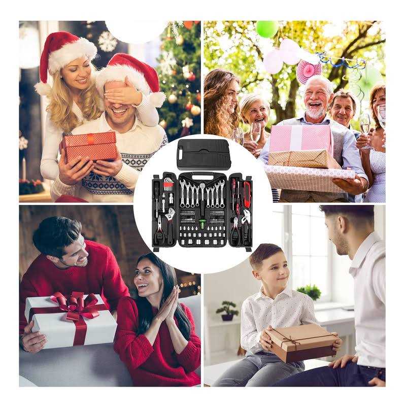 The tools are heat-treated with carbon steel and placed in a suitable box,compact carrying case for storage and portability. This 95 piece kit contains the basic tools needed for daily use and can be used for most small repairs around the house. It can be used to repair leaking kitchen or bathroom faucets, repair bicycles, or DIY. Include utility knife, water pump plier, screwdrivers, diagonal cutting plier, combination wrenches, ratchet handle, level, bits, hex key wrenches, spark plug socket, drive Adaptor, drive extension bar, bit driver handle, adjustable wrench, ong nose plier, drive-sockets. As a good choice for gifts, it is suitable for craftsmen, construction workers and mechanics. It can also be used as birthday gifts and Christmas gifts to relatives and friends.