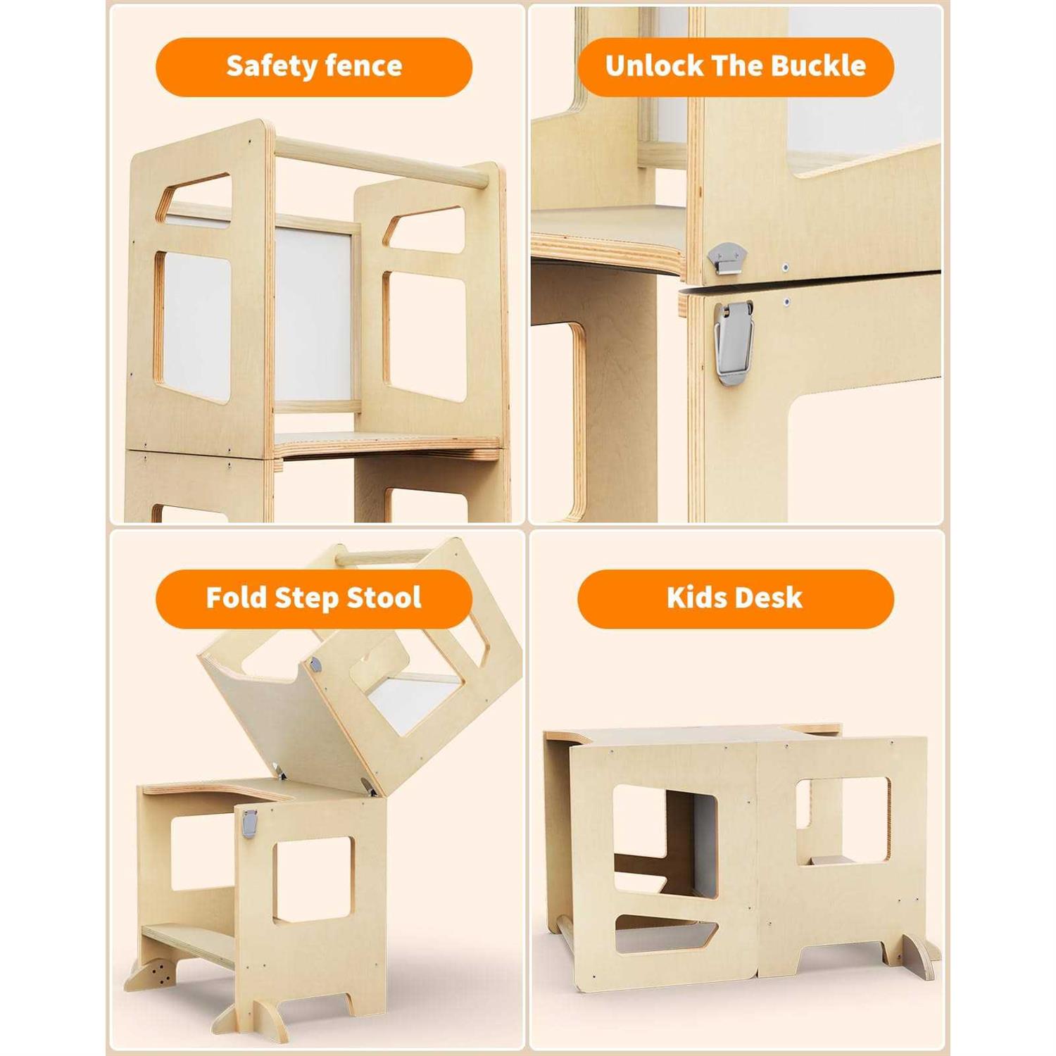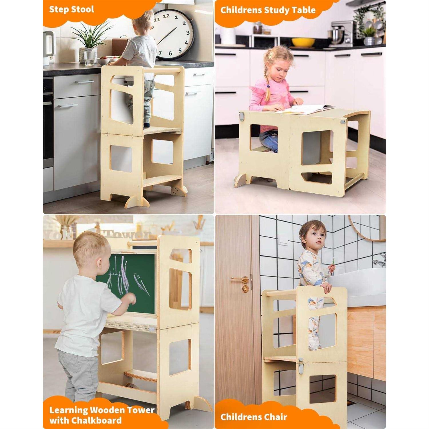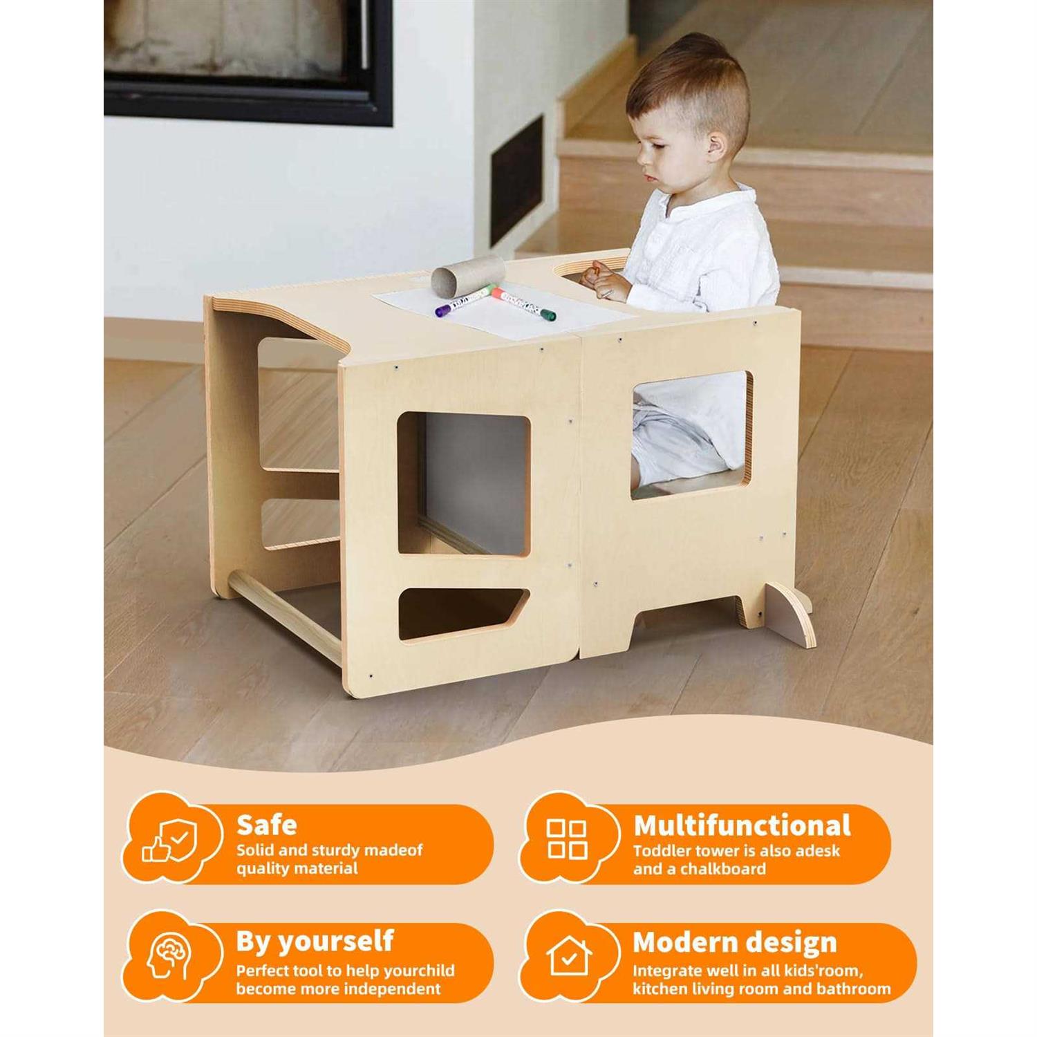 TODDLER STANDING TOWER:Toddler tower, art table,and chalkboard. Not only can it be used as a Kitchen Helper Stool, can be turned into a small table that can be used by two children together. Toddler step stool provides more space for your child to color, play, and develop their imagination. FAMILY COOKING FUN: Kids step stool elevates your baby to counter height. Children up to counter height to engage in cooking, crafts and other hands-on activities. Kitchen Standing Tower Perfect for encouraging independent play and exploration in the kitchen or other areas of the home HIGH-QUALITY SOLID WOOD: Wooden standing tower Made from high-quality designed to fit securely against your children’s rooms, kitchens and bathrooms, playroom or anywhere around the house. Besides, the Edges are Round Polished to Prevent Injury. PERFECT GIFT: A wonderful gift for your friends and family. This toddler standing tower will accompany kids growing up until your Child no longer needs it, As shown in the picture, you can assemble the DGD Learning Wooden Tower. remove the handrail, it can also be used as an adult ladder stool or shelf for potted plants or ornaments. No matter which of these Step Stool and Kitchen Assistant Stool for Toddlers you choose, you can be confident that you’re investing in a safe and durable way to help your child learn and grow.
