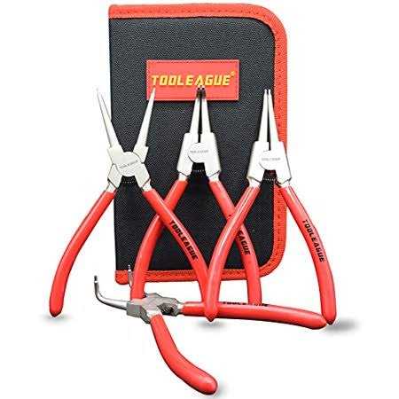 Brand: TOOLEAGUE Color: Red Features: HIGH QUALITY: TOOLEAGUE circlip pliers are forged from quenched 55# carbon steel. Each snap ring plier is treated with nickel and iron to improve corrosion resistance. The high-quality quality guarantees the repeated use and long-term use of the product. REASONABLE DESIGN: The snap ring pliers adopt the ergonomic design, non-slip handles, high-quality springs, stable opening and closing, perfect control of the whole, and provide users with a comfortable working experience. LABOR-SAVING DESIGN: One-piece 90-degree folding corners, refuse to break, easy to manipulate, and have a longer service life. Owning a good circlip plier can make your work easier and improve efficiency. WIDE RANGE OF USES: used in equipment, machinery industry, industrial assembly, household appliances, vehicles and other DIY maintenance, such as bicycles, agricultural machinery, locks, and other bearings fixed installation and disassembly WHAT YOU GET: 1x Straight Internal Plier, 1x Bent Internal Plier, 1x Straight External Plier, 1 x Bent External Plier, 1 storage bag. It is convenient for better storage and carrying. Part Number: 8 EAN: 0717664242881 Package Dimensions: 8.5 x 5.4 x 1.3 inches