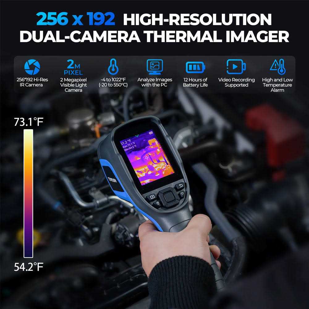 Topdon TC005 Handheld Thermal Imaging Camera The TC005 is a handheld thermal camera that measures an expansive temperature range. From -20°C to 550°C (-4°F to +1022°F), and offers a 12-hour runtime. The high-resolution 256*192 pixel infrared camera allows you to say goodbye to blurry images. The tool is ready for analysis with the standalone and the PC modes, enabling users to project and upload images from the TC to their PC. Added benefits of the TC005 include seven options for Pseudo-Color Display, a 2-megapixel visible light camera for overlapping images, and a picture-in-picture mode.