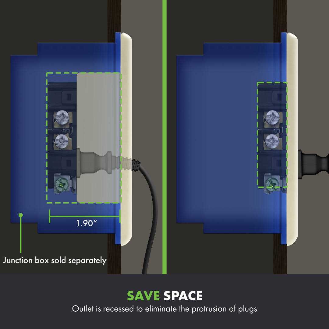 - The durable recessed frame reduces or eliminates the protrusion of plugs