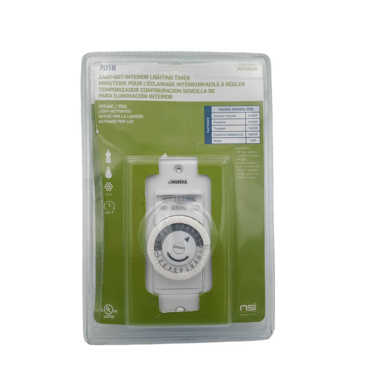 NSI Industries The TORK 701B timer allows you to set your indoor and outdoor lighting or appliances to automatically turn on and off, helping you to save energy and money, while adding convenience to today’s busy lifestyles. The timer can also provide home safety and security by turning lights on while you are away. The easy-to-use timer installs indoors in the wall and features 48 on/off settings and allows you to program a different setting each day of the week in as little as 30 minute intervals. A bypass slide switch allows the user to keep the timer always ON, always OFF or to TIMER to run the programmed settings. The timer is available in white with a grey and white Dial. Single gang wall plate is included. TORK has been a pioneer in the mechanical time switch industry since 1922.
