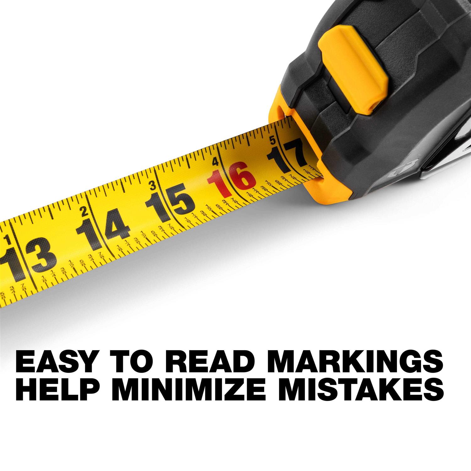 The ToughBuilt 35′ ProBlade Tape Measure with 11′ Honest Standout and Blade Control features an accurate, easy-to-read 1.25” wide blade with double-sided high contrast markings. With a nylon coating and protective film that helps retain strength and resists breakage, this tape measure is built for earnest durability. A magnetic hook utilizes a four-rivet construction with an underside reinforcement to withstand rigorous use. A prominent, finger-operated blade control button slows or stops the blade for added retraction control. Ergonomic design with rubber overmold provides added stability while reducing hand fatigue. The ToughBuilt ProBlade Tape Measure with 11′ Honest Standout and Blade Control is engineered to meet the needs of demanding Pros.