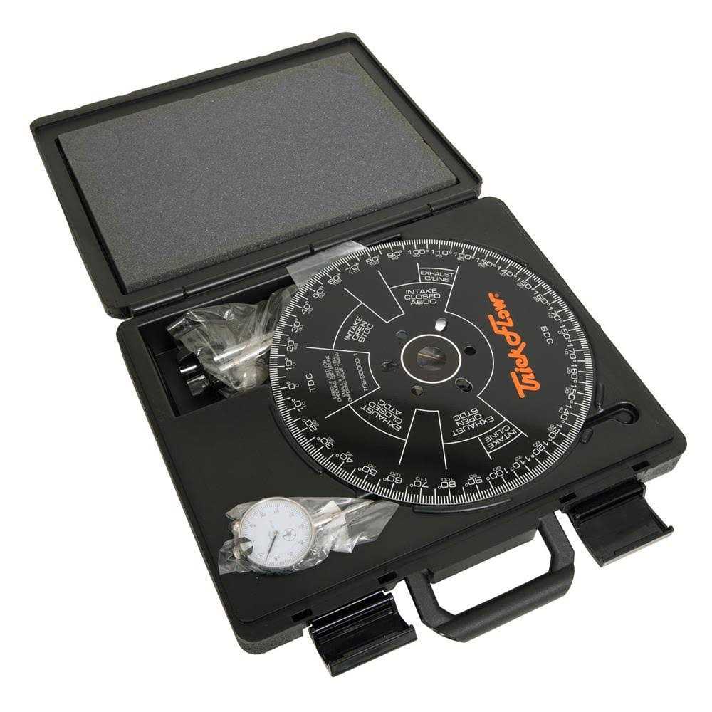 Trick Flows Cam Degree Kit will help dial in a camshaft accurately. In addition, the degree kits can also be used to check pistontovalve clearance, flywheel runout, crankshaft endplay, and ring gear backlash. The 11 inch diameter black degree wheels feature laseretched marks for easy reading and a one inch diameter center hole to accommodate aftermarket crankshaft sockets. Also included are two lowtension checking springs, a wire pointer, top dead center stop, three adapter bushings 3/8, 7/16, a