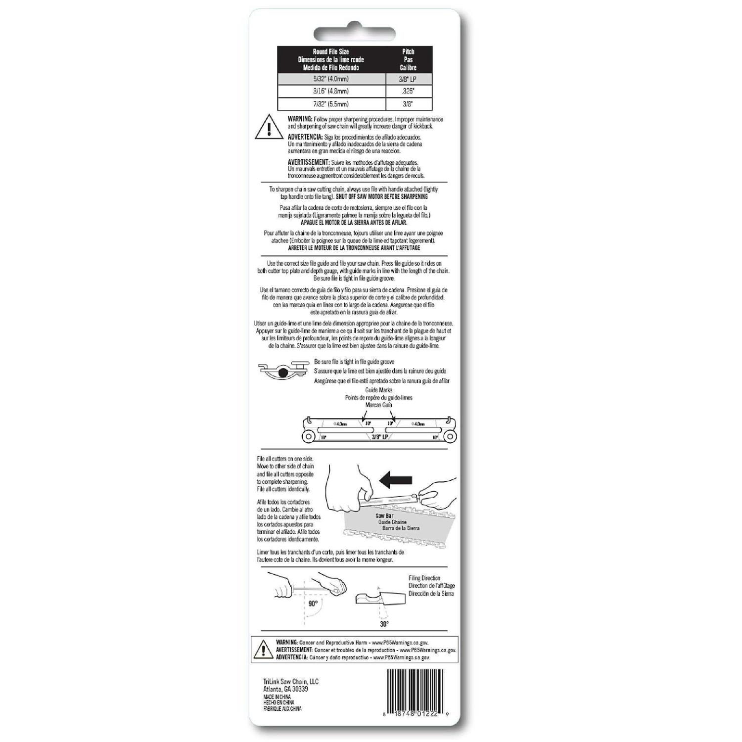 The TriLink 5/32 inch replacement round file is designed to be used in sharpening all 3/8 inch low profile pitch saw chain. The hardened carbon steel construction is precision spiral cut to provide clean, fast sharpening without scoring the cutter. A sharp chain is a safe chain. In order to properly sharpen your 3/8 inch low profile chain you should hold the 5/32 inch round file at a 90 angle from the chain itself. File all cutters on one side at a 30 angle, move to the other side of the chain and file all cutters at the same 30angle for a clean, consistent, identical sharpen. Each replacement round file pack contains two files. Files fit all standard handheld filing guides and bar mounted guides. For use sharpening saw chain on all Poulan, Husqvarna, Stihl, Echo, Remington, Ryobi, and many other chainsaws. Shut off chainsaw’s motor before sharpening and always follow proper sharpening procedures to reduce risk of danger.