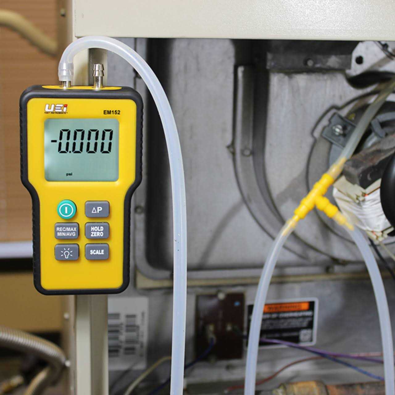 UEI EM152 Differential Pressure Digital Manometer with Dual Ports measures differential measurements up to 80.27 inH2O and positive and negative pressures from -60 to +60 inH2O. The UEi EM152 features an illuminated display, 11 different measurement scales, a magnetic backing for quick and easy mounting to metal surfaces, and more. The UEi EM152 is ideal for measuring pressure drops across supply and return registers, filters, cooling coils, and heat exchangers.