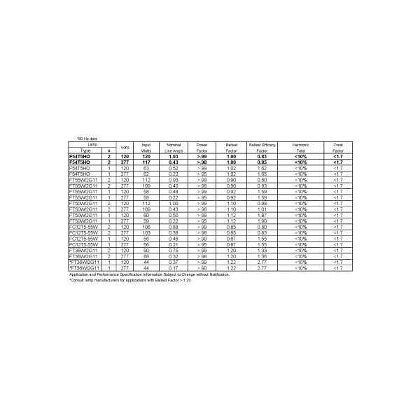 Universal Lighting Technologies Triad AccuStart5 Electronic fluorescent ballast is suitable for use with two F54T5HO lamps. It has voltage rating of 120 – 277 Volts and current rating of 0.41 – 0.96 Amp. Programmed rapid start ballast with 1 ballast factor, offers greater than 0.98/0.99 power factor. It features type 1 outdoor enclosure. It has series lamp connection. Ballast operates at the frequency rating of 50/60 Hz. It provides Class P protection. Ballast measures 16.88 Inch x 1.245 Inch x 1 Inch and withstands temperature rating of 75 deg C. Ballast is cULus listed.