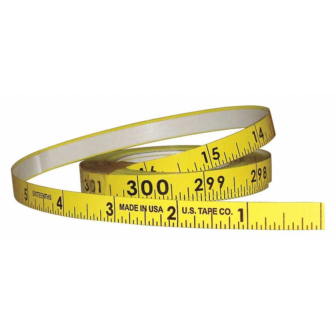This US TAPE Adhesive Backed Tape Measure is the perfect tool for keeping your measurements precise. The tape measure reads right to left, making it easier to read. This 300 in. SAE tape measure has a 3/8 in. blade width and a ft graduation type. It has an adhesive backing that sticks securely to smooth surfaces, allowing you to measure without pinching or bending the tape at all angles. Made of steel, this yellow blade is both rust and corrosion resistant. When you need a reliable tool for taking measurements on the go, this US TAPE Adhesive Backed Tape Measure will prove invaluable.