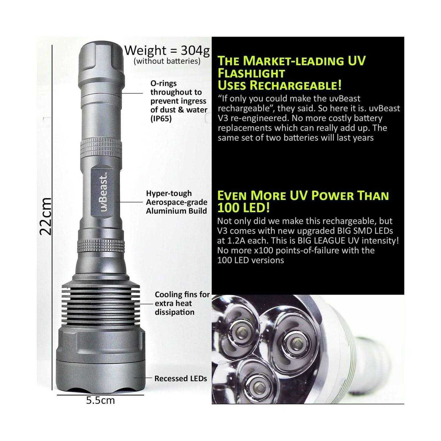 uvBeast New V3 385-395nm Black Light UV Flashlight HIGH Power Upgraded Triple Broad Band LEDs Best for Professional/Commercial Use