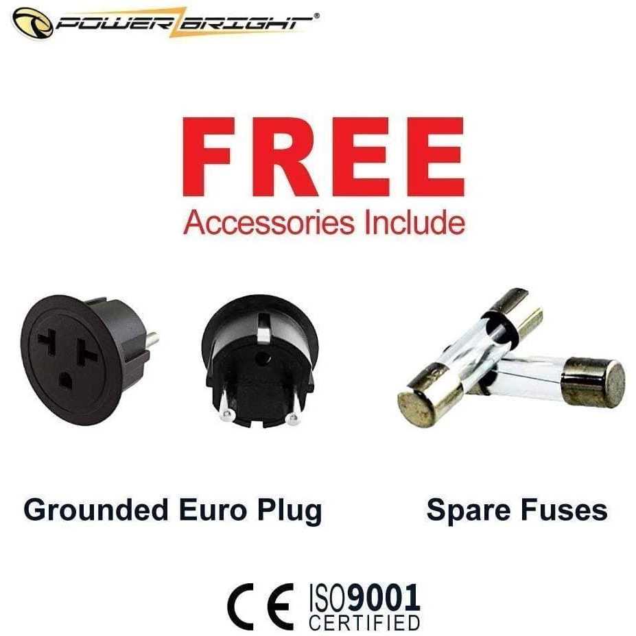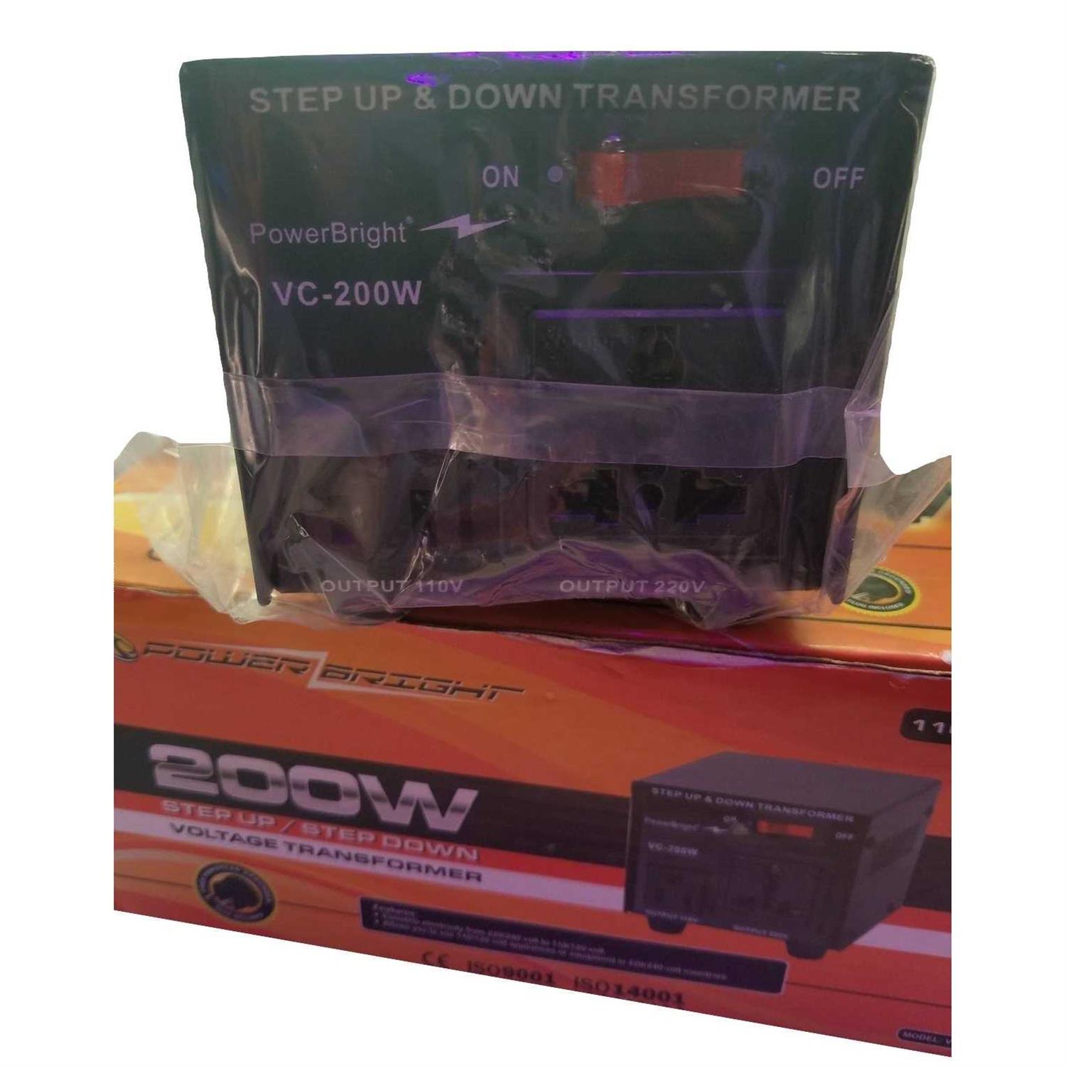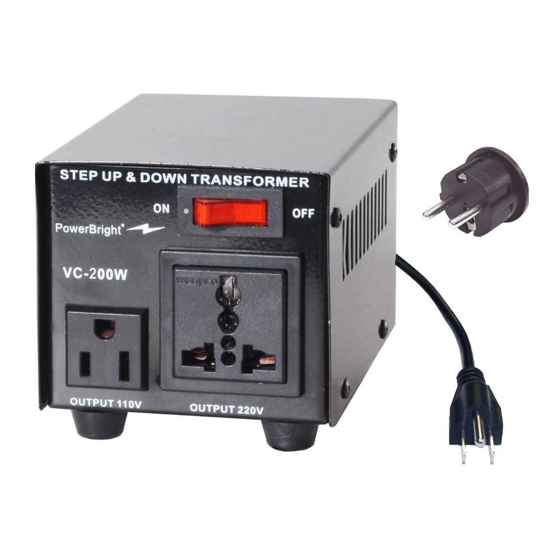 Power Bright series of step up/down voltage transformers offers you a safe, reliable, affordable & convenient solution to converting voltages from 110-120 volt up to 220-240 volt or from 220-240 volt down to 110-120 volt for both home use & industrial applications. The VC200W is rated at 200 watts maximum. There are a total of two outputs on the front panel. For safety, its recommended by the manufacturer that the voltage transformers maximum power should be equal or greater than the power rating of your appliance multiplied by 1. 5. For example, if you have an appliance rated at 100 watts, you will need to pick a transformer with a maximum power of 150 watts or greater.