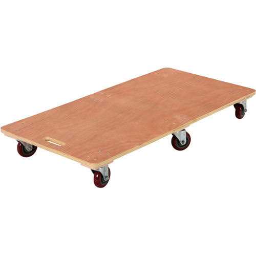 SIX-WHEEL WOOD DECK MOVERS DOLLY Oversized Dolly is great for Moving Large Items This dolly features a 48″L x 24″W hardwood deck that’s useful for moving bulky, oversized cargo. Assembles easily. Solid Wood Dolly is manufactured from durable ” thick plywood construction for carrying smaller packages. Integral hand hole allows for easy portability. Rolls smoothly with (6) 4″ swivel non-marking polyurethane casters.