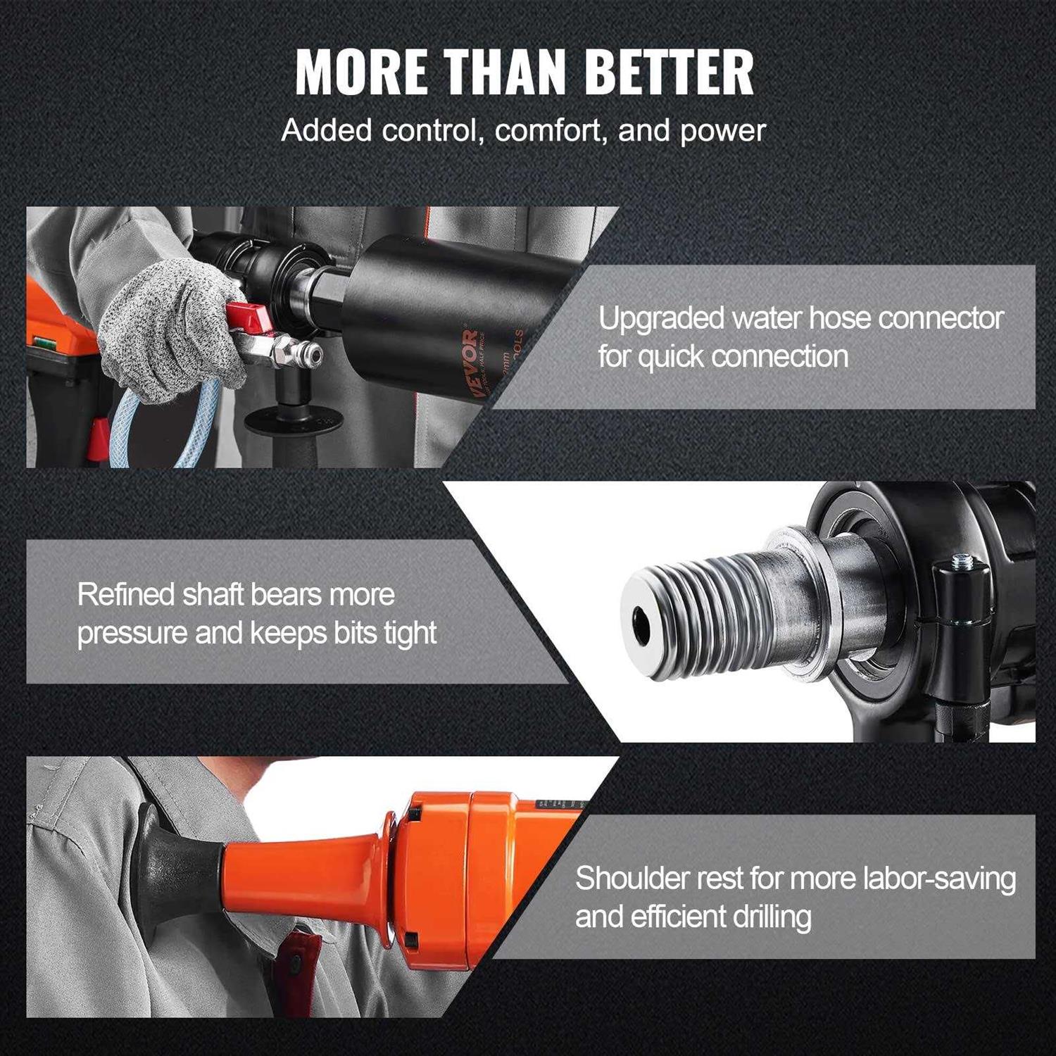 4-inch Wet Drilling: Our lightweight handheld core drilling machine can perform wet drilling, and you can feel assured of accuracy when boring holes in a variety of surfaces with a 3.1-4 in / 8-10.2 cm diameter hole capacity. More importantly, a industrial-grade 4in core bit with 1-1/4″ thread is thoughtfully included. Two Gear Speed: Our 2-speed electric core drill, 1100RPM / 2400RPM, has a convenient gearbox allowing different speeds to match the type of material being drilled and helping control the ideal speed for the job. 1500W strong motor to ensure the machine drilling fierce and consistent work. Effortless Drilling: Our handheld drilling rig has a rustproof steel forged output shaft to bear more pressure, an upgraded one-touch water pipe connector for a stable water supply, and a shoulder rest for you to easily carry the core drill rig on your shoulder and reduce friction caused by drilling. 2 Bubble Levels for Precision: Two fluorescent yellow-green measuring bubble level tools are placed on the core drilling housing to make adjustments more convenient, accurate, and easy to use. The bubble is clearly visible from all sides, helping you adjust the bit position and ensure the holes punched are at the same level. Built for Heavy-Duty Concrete Drilling: The compact size makes it easy to maneuver in drilling reinforced concrete, red brick, marble, and other materials. Our wet diamond core drilling rig will surely meet professional demands and is for more than just home use. With our compact drill kit, you can quickly install air conditioners, kitchen pipes, stair railings, repair highways, etc.