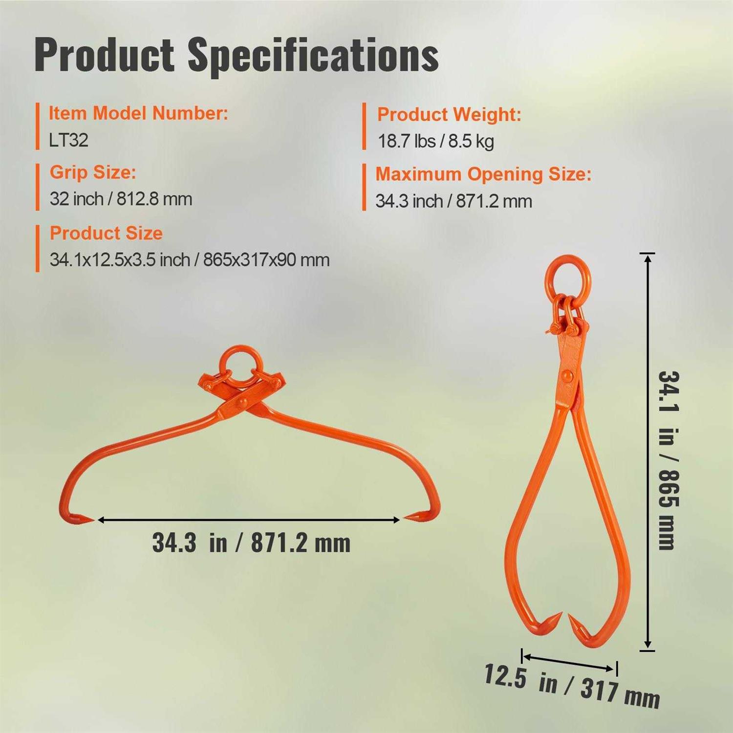 Large Opening Size: With a 34.3″ max opening and a 32″ gripping size, our log skidding tongs are perfect for lifting and moving large logs. They can also be used for handling hay stacks, cables, stones, and other items. Get the heavy-duty lifting job done efficiently! Sharp Claw Hooks: The log lifting tongs with a powerful eagle claw design is specifically used for securely gripping and holding logs during transport. As you pull, the hooks tighten their grip, providing you with a stronger and safer grasp. Heavy-Duty Loading Weight: Made from thick #45 steel, our log tongs can bear loads up to 1543 lbs. No need to worry about bending or breaking. The spray-painted surface provides rust-proofing and durability, even when used on rough terrain. Integrated Suspension Ring: Equipped with a seamlessly integrated suspension ring that can be connected to a vehicle with a chain, making it easy to heft and move heavy logs. The timber claw hook provides a strong and reliable connection, ensuring long-lasting use without the risk of breakage or damage. Fit for Various Vehicles: The skidding tongs are ideal for use with tractors, off-road vehicles, ATVs, trucks, forklifts, and other vehicle types. Say goodbye to manual labor and enjoy effortless and efficient log transport with your vehicles.