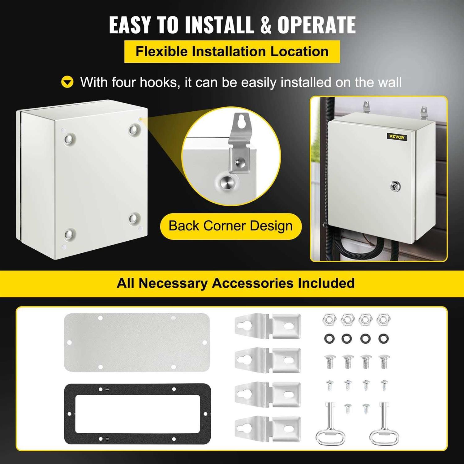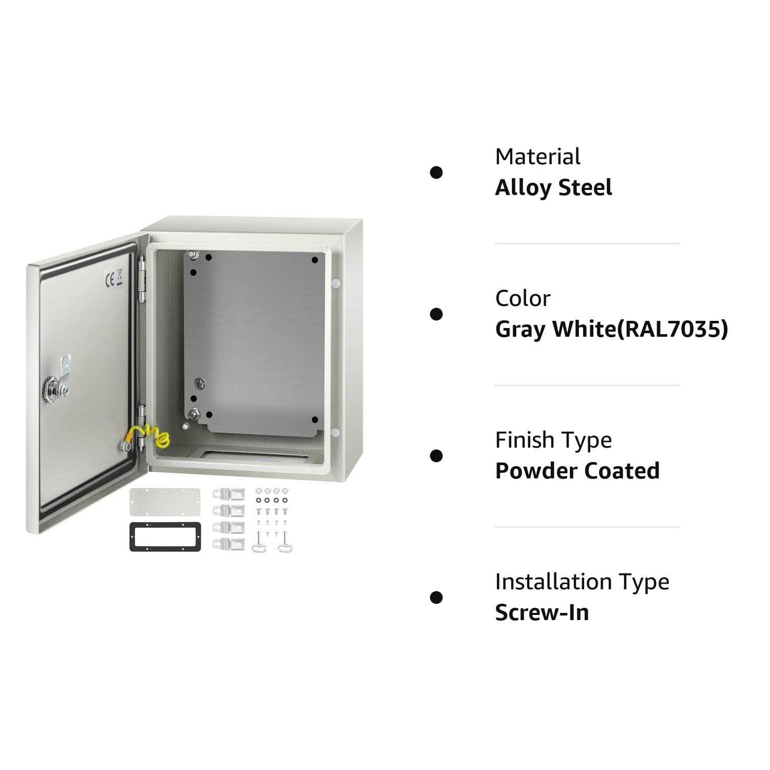 【STURDY CONSTRUCTION】- The electrical enclosure adopts professional carbon steel made by precise cutting and welding. It has stronger wear resistance and can prevent rain erosion—the epoxy polyester powder coating for good mechanical properties and leveling property. 【REINFORCED LOCK & HINGE】- The electronic equipment enclosure box features a high-quality lock core with a reliable precision structure that is not easy to fall off. The high-strength hinge is applied to ensure that the box door is not easily damaged or broken by extrusion. 【WATERPROOF SEALING STRIP】- The hinged junction box is sealed with rubber strips to prevent rainwater from entering and protecting internal electrical. The steel electrical box is built with an IP65 protection class and earthing screw to ensure electrical and product security. 【CONVENIENT INSTALLATION】- The metal enclosure box is equipped with a removable galvanized mounting backplate to facilitate installing the electrical components. Complete accessories and four wall mounting holes in the back make it easy to fix the wall’s electrical box. 【EXTENSIVE USE】- Steel electrical box is suitable for indoor and outdoor applications to protect circuits and prevent corrosion. It is ideal for industrial equipment and medical devices, such as factories, construction sites, malls, squares, residential areas, courtyards, etc.