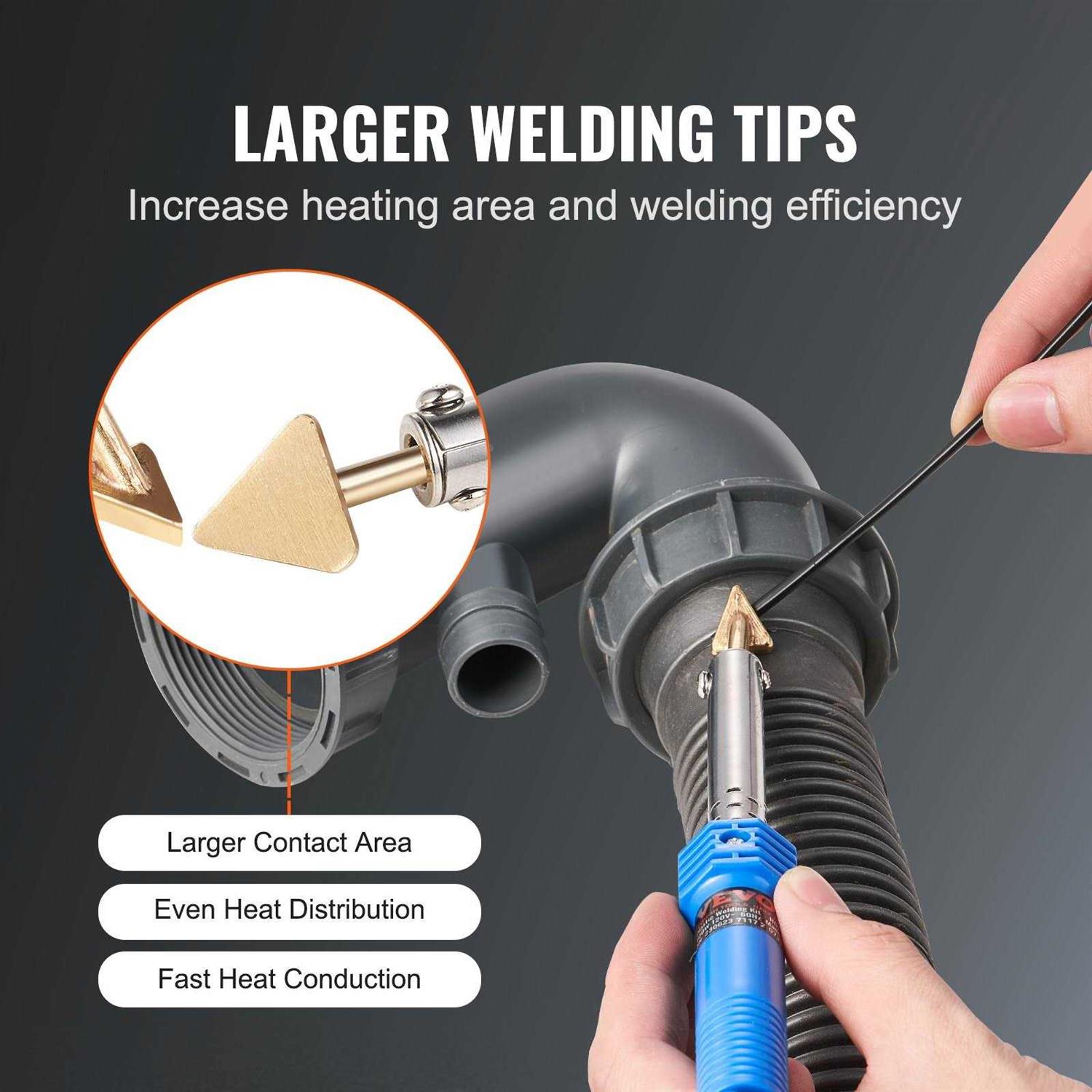 100W Highly Powerful Welding: VEVOR plastic welding gun boasts a 100W powerful output, making it an efficient and reliable assistant for all your welding tasks. It employs advanced heating technology, achieving quick repairs on various plastic surfaces within 3 minutes. Larger Welding Area: Our plastic repair welder kit comes with 3 iron tips (2 welding tips and 1 soldering iron tip), with large contact areas and fast heat conduction. The large welding tip is for large welding areas, the small tip is for fine welding, and the soldering iron tip is perfect for electronics repairs. Weld Smarter and Faster: 1.5m UL extended power cord provides greater flexibility in welding work, allowing for free movement without being restricted by the distance from the power outlet. You can effortlessly handle large workpieces and access tight corners, enabling more precise and efficient welding. Wide Applications: Our bumper crack welding kit is capable of handling various plastic surfaces, such as car bumper, dashboard, kayak, canoe, lamp holders, plastics rings, and daily plastics supplies. Additionally, the included soldering iron tip can also be used for electronic soldering repairs. Whether for household repairs or professional work, this plastic welder is up to your work. Easy to Use: Complete your plastic repair tasks effortlessly just in 3 steps. First, use sandpaper to smooth the damaged area. Next, melt the plastic welding rod and fill it into the damaged area, allowing it to fuse with the surrounding plastic. Lastly, use sandpaper again to achieve a smooth and even surface in the repaired area.