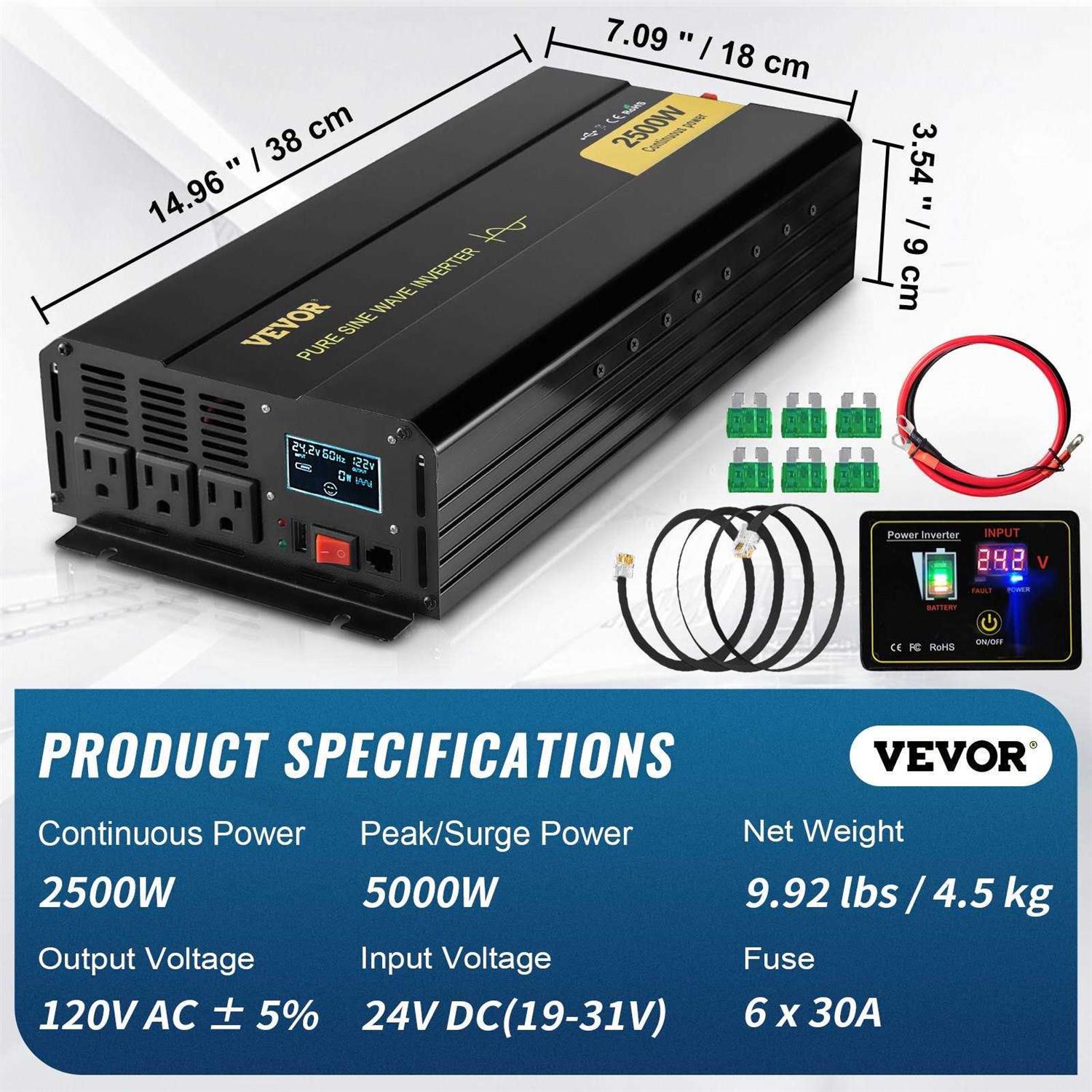 VEVOR Pure Sine Wave Inverter 2500 Watt Power Inverter DC 24V to AC 120V Car Inverter CZXNBQDMKWKDDQK53V9 810087871413 2500W Pure Sine Wave Power Inverter 24V to 120V & Aluminum Alloy Shell & Easy Remote Control Are you ready to confidently power up your electronics This pure sine wave inverter is highly recommended for sensitive electronic equipment that requires cleaner AC power to operate effectively. Clear LCD display intelligent cooling fan and multiple protections provide reliabl…