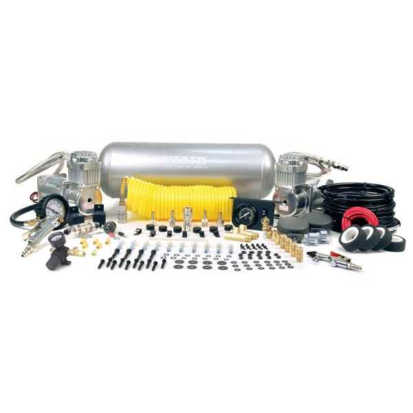 P/N 10000 Ultra Light Duty Onboard Air System can be used to pressurize the included one gallon air tank for air horn use, off road air locking differential use, and a host of other light duty pneumatic needs. While not intended to inflate tires, this onboard air system provides a reliable smaller volume, 105 psi air source, in a cost effective package. Onboard Air Systems (Oba) are complete pneumatic systems intended to accomplish various tasks, depending on the kit selected. Viair offers OBA systems for smaller compressed air requirements that have a shorter duty cycle need, as well as other systems that provide up to 100% duty cycle and increased air volume by providing a larger tank for compressed air storage. Each Onboard Air System comes complete with compressor(s), air tank, fittings, pressure switch, relay(s), electrical connectors and all applicable accessories.