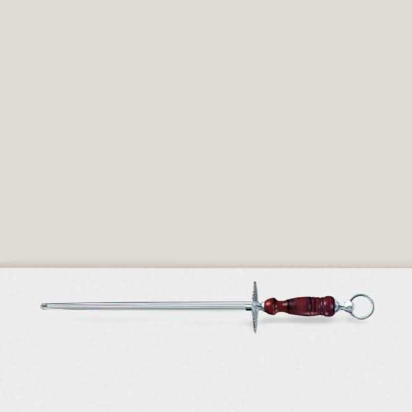 The Victorinox / Forschner 40180 wood handle sharpening steel is a fine cut 14″ round rod to smooth minor imperfections in your blade. The reference to “flat oval or round” has to do with the cross sections of the rod. The Forschner / Victorinox 40180 sharpening steel also referred to as a honing steel is really used to displace imperfections which in turn makes your knife cut through product better. To achieve the best results steeling should be performed immediately before or after using your knife each day.