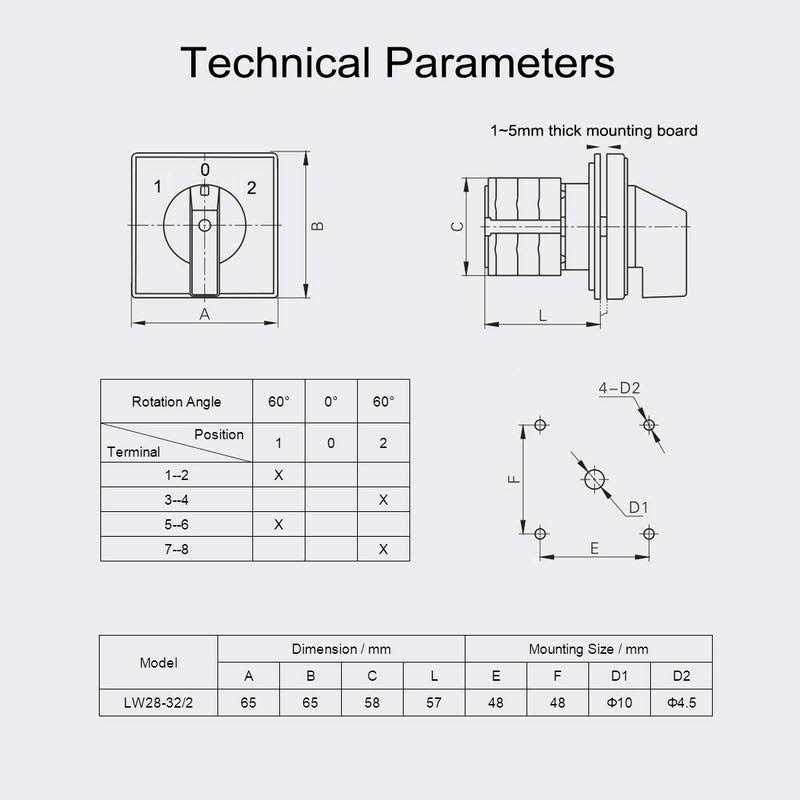 Description 1. Suitable for the thickness between 1mm to 5mm of the mounting board. 2. Ideal choice for electrical wiring in the power switches, speed switches and asynchronous motor for their start-up and reversing, also can make the conversion of the control circuit. 3. Widely used as circuit control switches, test equipment switches, motor control switches and master control switches, signal transfer switches, or change-over switch for electric welding machinery and other equipment. Image3 has shown which terminal will be connected in different position , please read the wiring diagram as a reference. Position 1 : 1-2 , 5-6 Position 0 : All terminal disconnected Position 2 : 3-4 , 7-8 Specifications Model: LW28-32/2 Positions: 3 Terminals: 8 Ui: 690V Ith: 32A Action Type: Latching Positioning angle: 60-0-60 Degree Rating: DC-13: Ui: 220V, Ith: 0.14A; AC-15: Ue / Ie: 380V / 1.5A Mounting Hole Distance: 48mm x 48mm / 1.89inch x 1.89inch (L*W) Total Size: 65mm x 65mm x 94mm / 2.59inch x 2.59inch x 3.7inch (L*W*H) Package Content 1 x Changeover Switch 4 x Mounting Screws