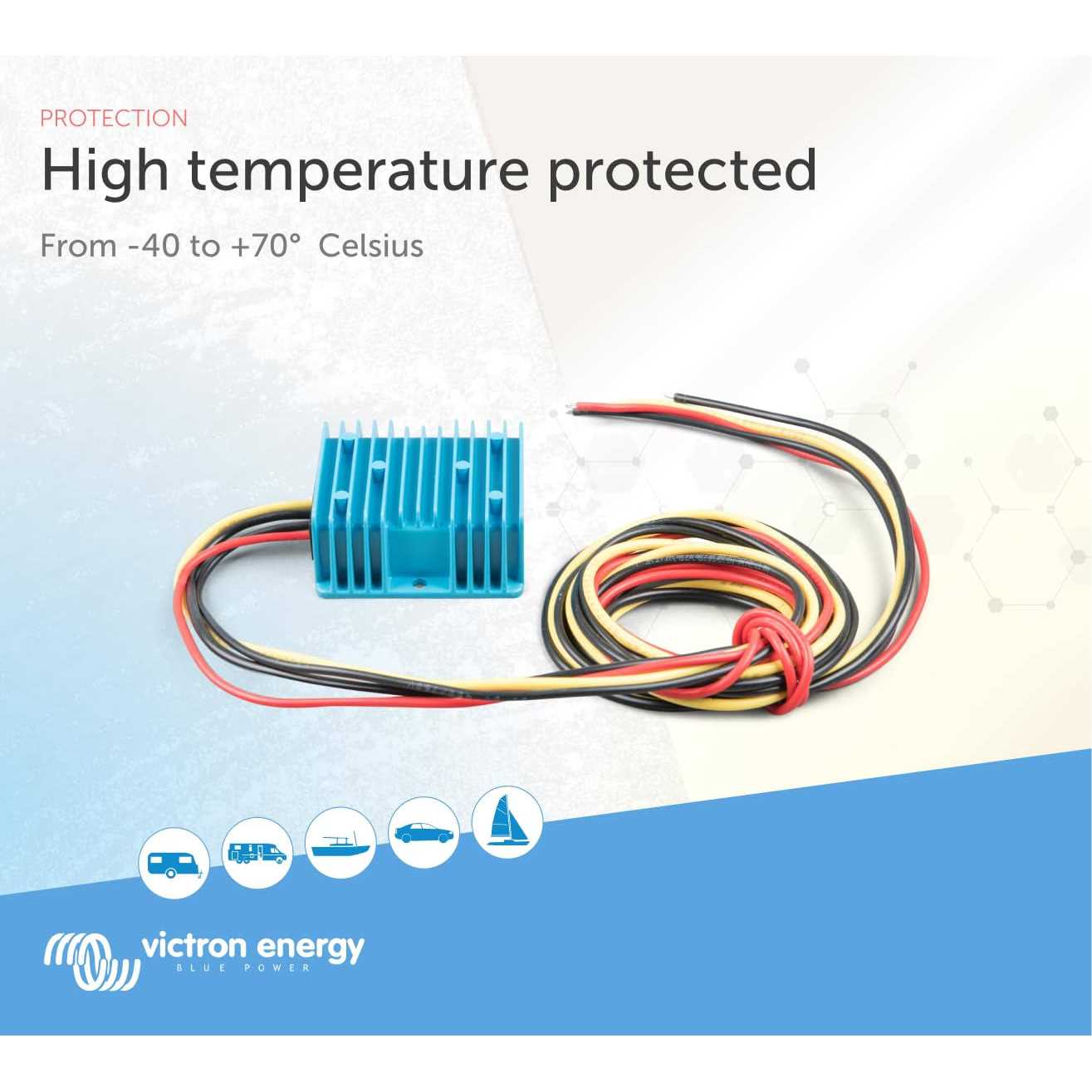 The Victron Orion voltage dropper is designed to convert an input voltage of 24V DC (in fact anywhere between 15V and 40V DC) into a 12V DC output for use on most electrical items on board boats, motorhomes and other automotive applications. The casing is made of cast aluminium and the electronics are moulded in resin. All this gives the Victron Orion an IP67 rating, protecting it from any water, oil or dirt that could make contact with it. There is also added protection against overheating, short circuits and reverse polarity connection. This voltage converter includes 1.8 metre long cables, which should eliminate the need to add cable interconnections in most cases. This adds to the reliability of the product and decreases cost and installation time.