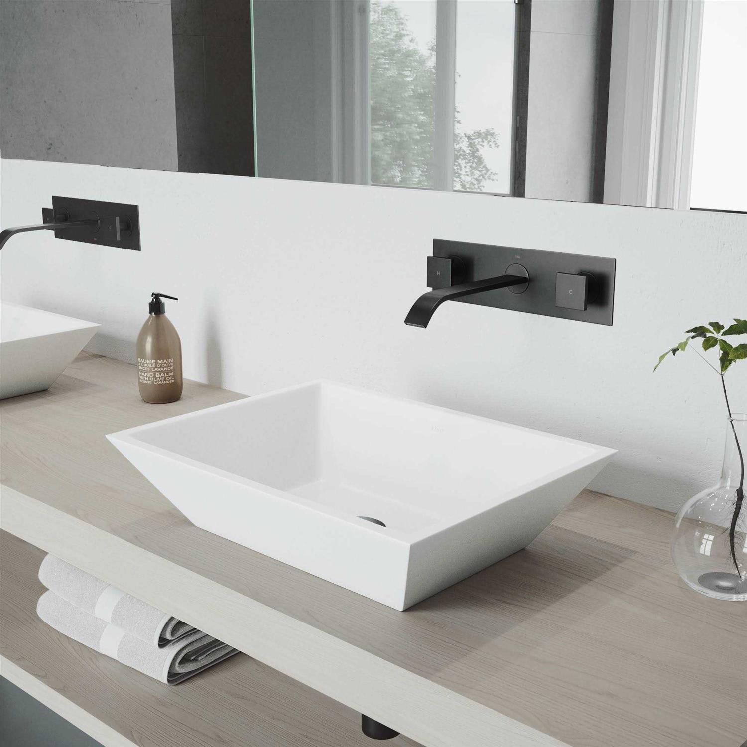 Crafted in solid brass, the VIGO Titus wall mount bathroom faucet stands the test of time and makes a dramatic effect paired with your bathroom sink. Its sleek, modern design elevates any bathroom and leaves the countertop cleared for a more contemporary look. VIGO VG0500. Faucet body constructed of Brass Brass is highly resistant to corrosion and an excellent choice to withstand high temperatures Widespread mounting type Dual Knob handles control the flow and temperature of water Faucet includes ceramic disc valve Drain assembly not included? when adding to cart, option will be presented All hardware required for installation is included Low lead compliant VIGO VG05002 Specifications: Height: 3-1/8” Spout Reach: 8-1/4” (wall to spout outlet) Flow Rate: 1.2 gallons-per-minute Faucet Centers: 8” (distance between centers of outside faucet holes) Faucet Holes: 3 (minimum number of holes required for installation) Color: matte black. Gender: unisex..
